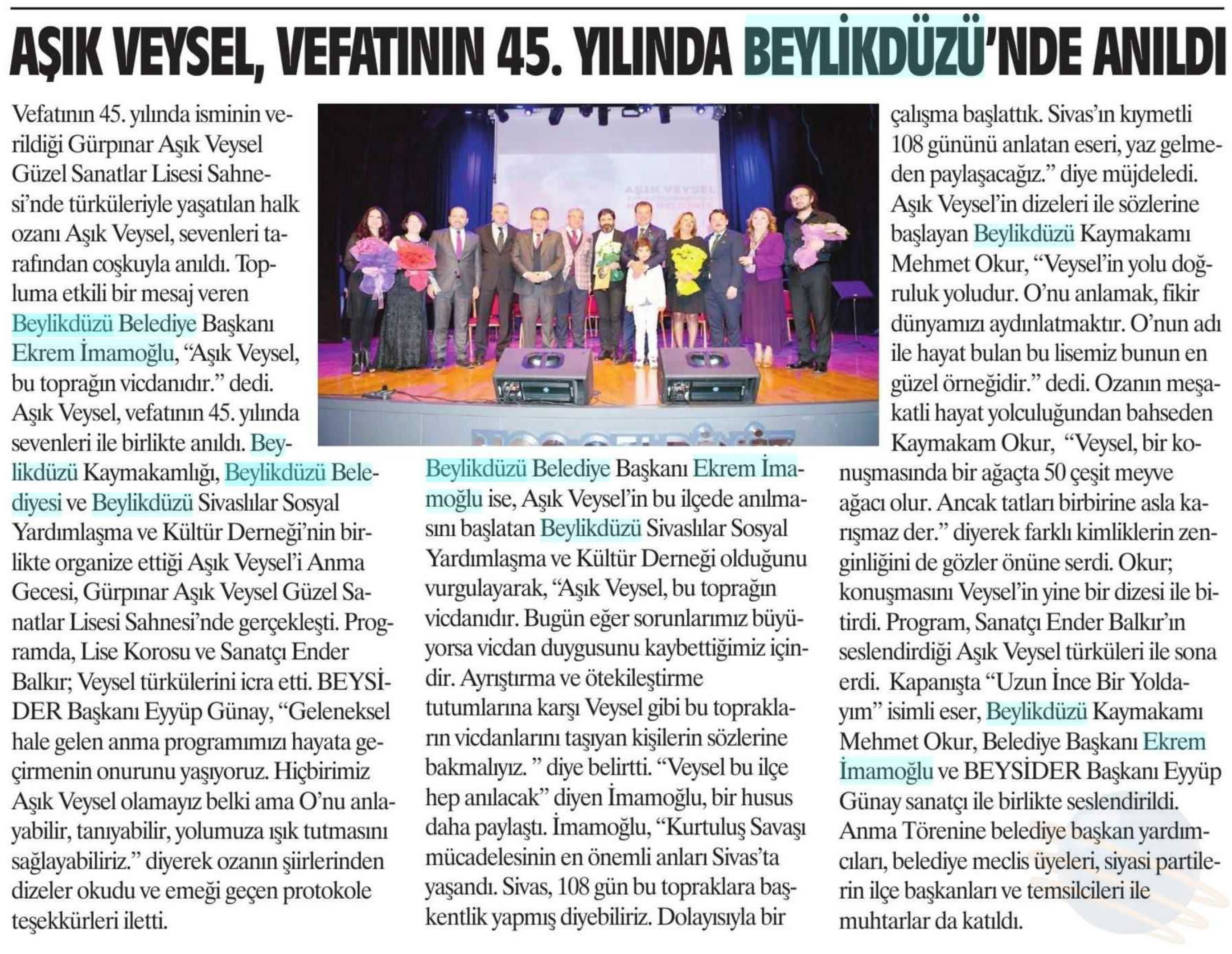 29 Mart 2018 tarihli "ZEYNA" gazetesi. Vefatının 45. yılında isminin verildiği Gürpınar Aşık Veysel Güzel Sanatlar Lisesi Sahnesi'nde türküleriyle yaşatılan halk ozanı Aşık Veysel, sevenleri tarafından coşkuyla anıldı.