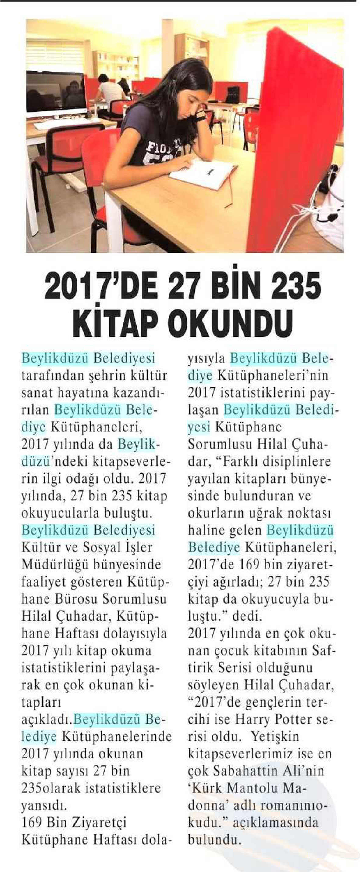 27 Mart 2018 tarihli "BÜYÜKÇEKMECE" gazetesi. Beylikdüzü Belediyesi tarafından şehrin kültür sanat hayatına kazandırılan Beylikdüzü Belediye Kütüphaneleri, 2017 yılında da Beylikdüzü'ndeki kitapseverlerin ilgi odağı oldu. 2017 yılında, 27 bin 235 kitap okuyucularla buluştu.