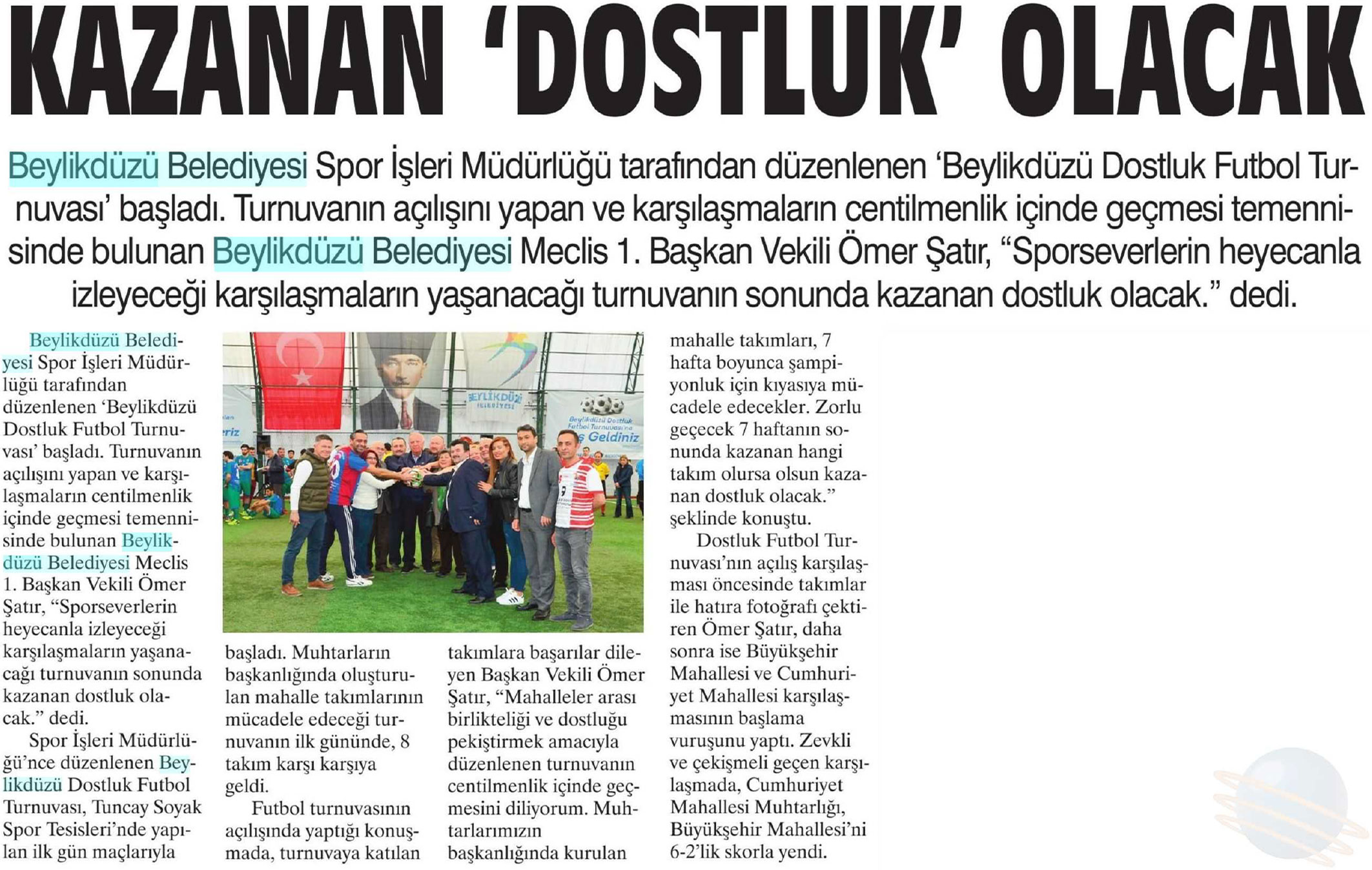 4 Nisan 2018 tarihli "ZEYNA" gazetesi. Beylikdüzü Belediyesi Spor İşleri tarafından düzenlenen ' Beylikdüzü Dostluk Futbol Turnuvası' başladı. Turnuvanın açılışını yapan ve karşılaşmaların centilmenlik içinde geçmesi temennisinde bulunan Beylikdüzü Belediyesi Meclis 1. Başkan Vekili Ömer Şatır, "Sporseverlerin heyecanla izleyeceği karşılaşmaların yaşanacağı turnuvanın sonunda kazanan dostluk olacak." dedi.