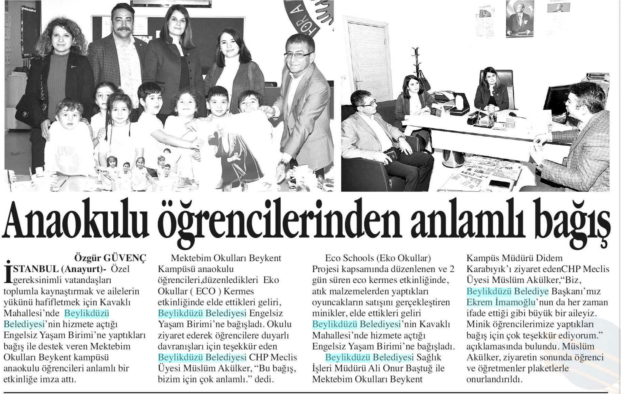 5 Nisan 2018 tarihli "ANA YURT" gazetesi. Mektebim Okulları Beykent Kampüsü anaokulu öğrencileri, düzenledikleri Eko Okullar ( ECO) Kermes etkinliğinde elde ettikleri geliri, Beylikdüzü Belediyesi Engelsiz Yaşam Birimi'ne bağışladı. Okulu ziyaret ederek öğrencilere duyarlı davranışları için teşekkür eden Beylikdüzü Belediyesi CHP Meclis Üyesi Müslüm Akülker, "Bu bağış, bizim için çok anlamlı" dedi.