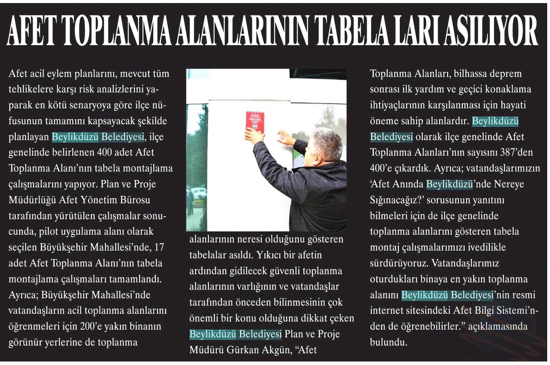 9 Nisan 2018 tarihli "İSTANBUL" gazetesi. Beylikdüzü Belediyesi, ilçe genelinde belirlenen 400 adet Afet Toplanma Alanı'nın tabela montajlama çalışmalarını yapıyor.