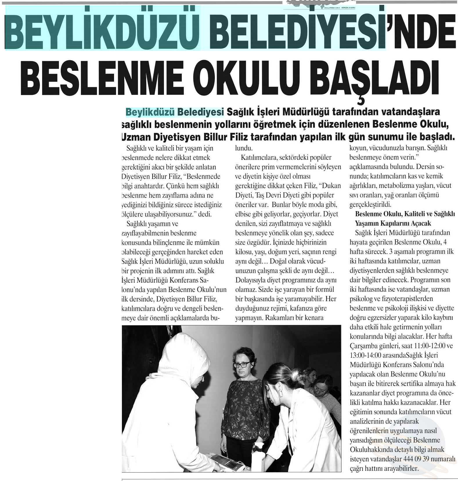 9 Nisan 2018 tarihli "YURT HABER" gazetesi. Beylikdüzü Belediyesi Sağlık İşleri Müdürlüğü tarafından vatandaşlara sağlıklı beslenmenin yollarını öğretmek için düzenlenen Beslenme Okulu, Uzman Diyetisyen Billur Filiz tarafından ilk gün sunumu ile başladı.