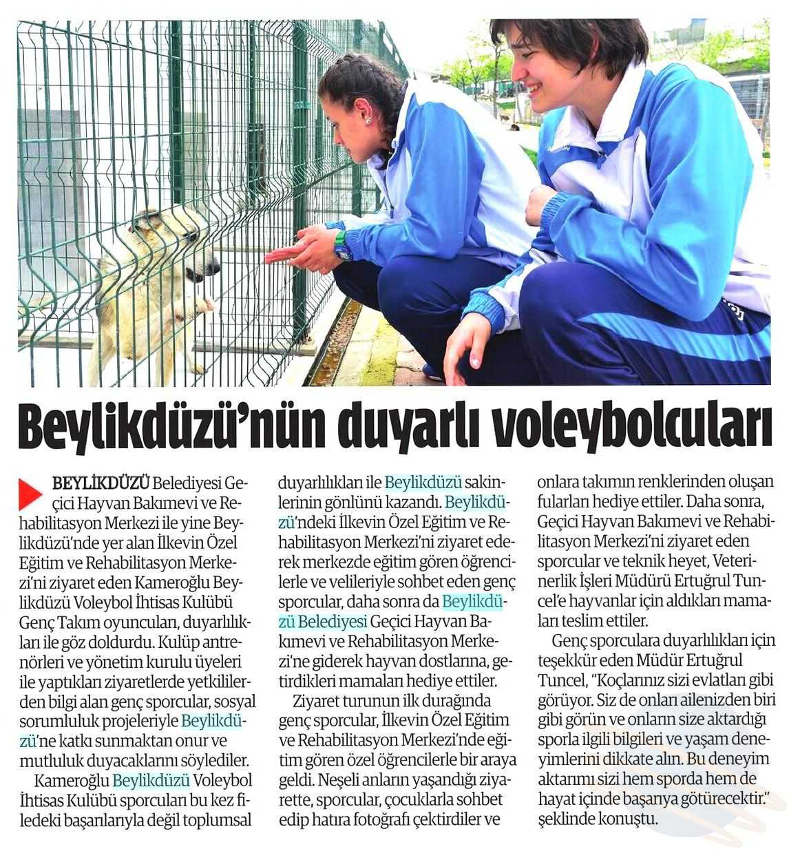 14 Nisan 2018 tarihli "HARBİ" gazetesi. Beylikdüzü Belediyesi Geçici Hayvan Bakımevi ve Rehabilitasyon Merkezi ile yine Beylikdüzü'nde yer alan İlkevin Özel Eğitim ve Rehabilitasyon Merkezi'ni ziyaret eden Kameroğlu Beylikdüzü Voleybol İhtisas Kulübü Genç Takım oyuncuları, duyarlılıkları ile göz doldurdu.