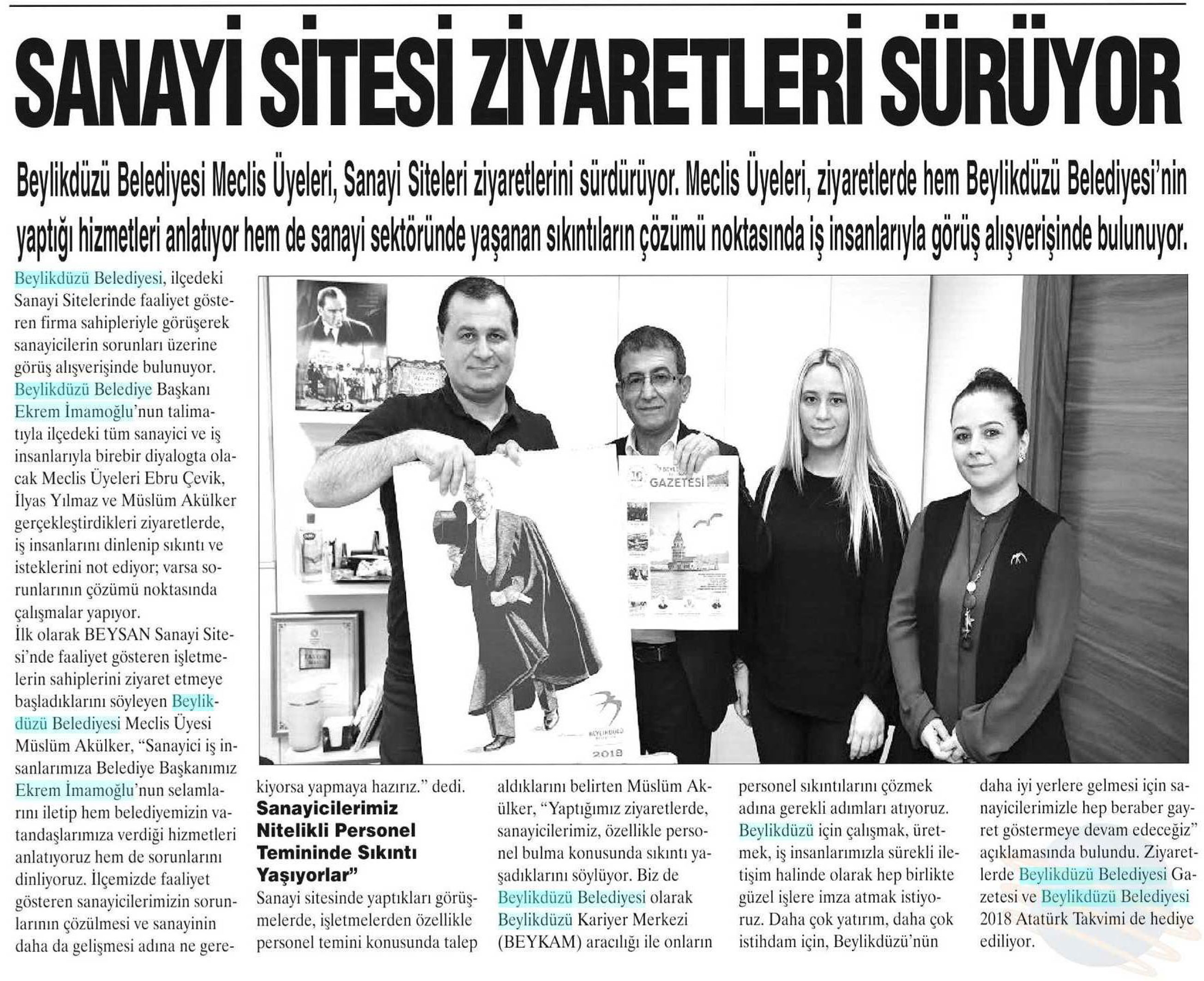 19 Nisan 2018 tarihli "BÜYÜKÇEKMECE" gazetesi. Beylikdüzü Belediyesi Meclis Üyeleri, Sanayi Siteleri ziyaretlerini sürdürüyor. Meclis Üyeleri ziyaretlerde hem Beylikdüzü Belediyesi'nin yaptığı hizmetleri anlatıyor hem de sanayi sektöründe yaşanan sıkıntıların çözümü noktasında iş insanlarıyla görüş alışverişinde bulunuyor.
