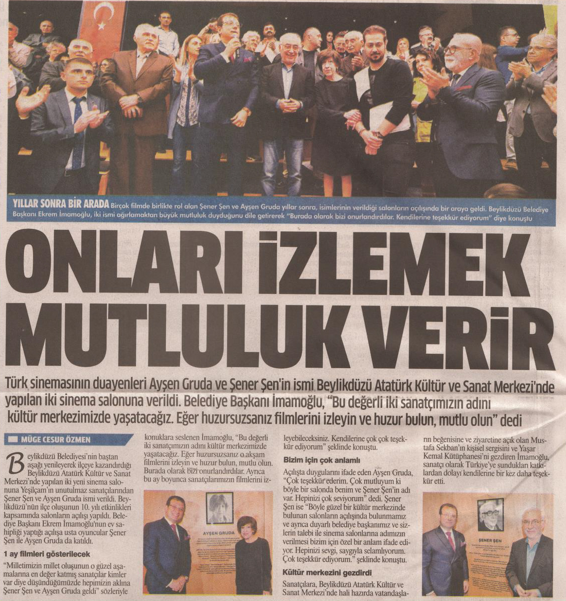 11 Mayıs 2018 tarihli "DAMGA" gazetesi. Türk sinemasının duayenleri Ayşen Gruda ve Şener Şen'in ismi Beylikdüzü Atatürk Kültür ve Sanat Merkezi'nde yapılan iki sinema salonuna verildi. Belediye Başkanı İmamoğlu, "Bu değerli iki sanatçımızın adını kültür merkezimizde yaşatacağız. Eğer huzursuzsanız filmlerini izleyin ve huzur bulun, mutlu olun" dedi.