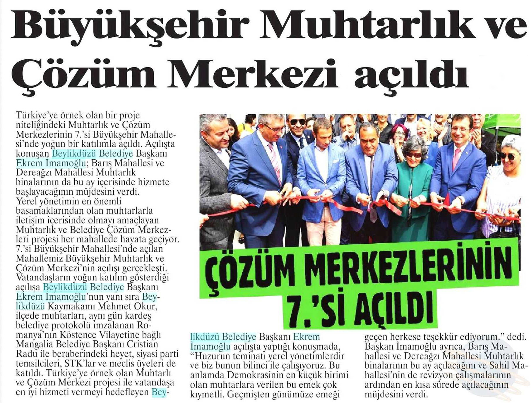 10 Mayıs 2018 tarihli "NABIZ" gazetesi. Türkiye'ye örnek olan bir proje niteliğindeki Muhtarlık ve Çözüm 7.si Büyükşehir Mahallesi'nde yoğun bir katılımla açıldı. Beylikdüzü Belediye Başkanı Ekrem İmamoğlu; Barış Mahallesi ve Dereağzı Mahallesi Muhtarlık binalarının da bu ay içerisinde hizmete başlayacağının müjdesini verdi.