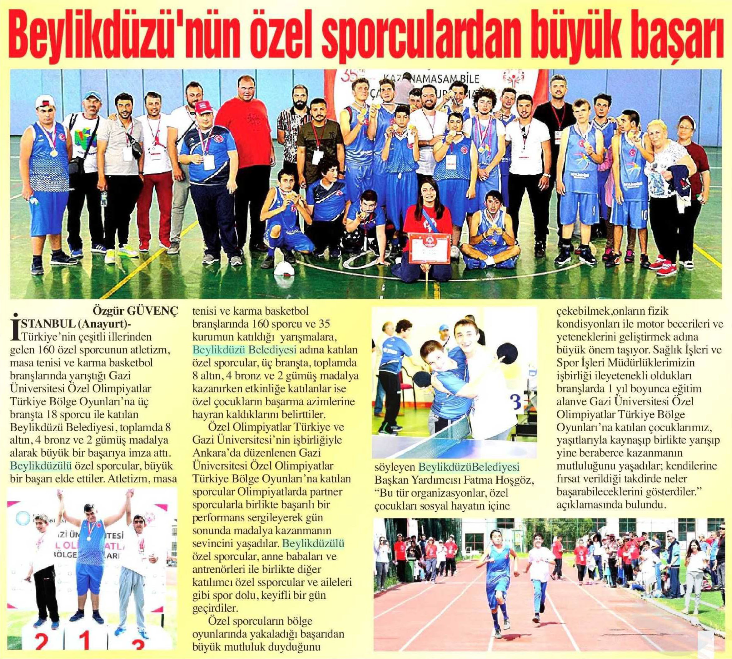 15 Mayıs 2018 tarihli "ANAYURT" gazetesi. Türkiye'nin çeşitli illerinden gelen 160 özel sporcunun atletizm, masa tenisi ve karma basketbol branşlarında yarıştığı Gazi Üniversitesi Özel Olimpiyatlar Türkiye Bölge Oyunları'na üç branşta 18 sporcu ile katılan Beylikdüzü Belediyesi, toplamda 8 altın, 4 bronz ve 2 gümüş madalya alarak büyük bir başarıya imza attı.