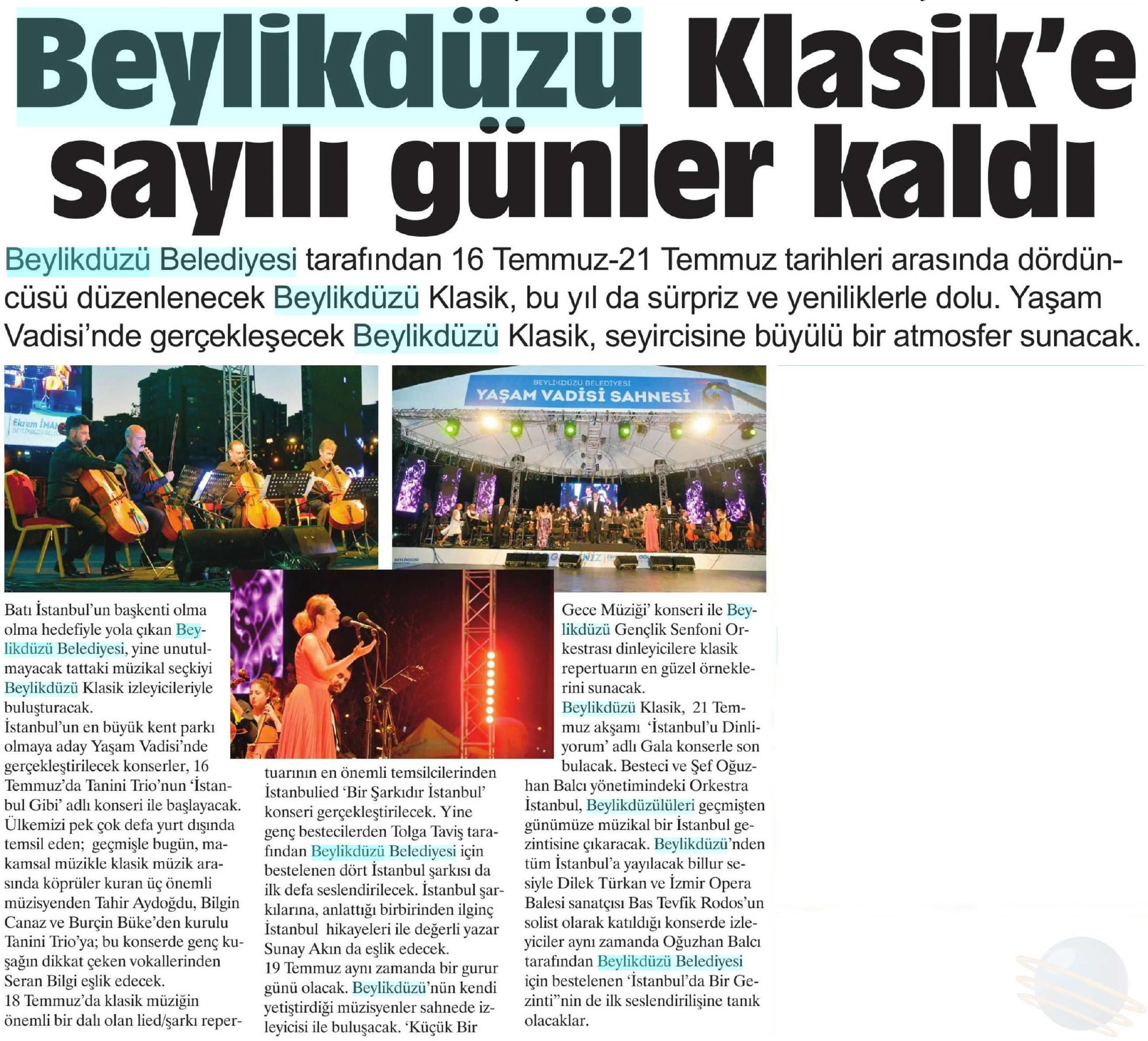 4 Temmuz 2018 tarihli "ZEYNA" gazetesi. Beylikdüzü Belediyesi tarafından 16 Temmuz-21 Temmuz tarihleri arasında dördüncüsü düzenlenecek Beylikdüzü Klasik, bu yıl da sürpriz ve yeniliklerle dolu. Yaşam Vadisi'nde gerçekleşecek Beylikdüzü Klasik, seyircisine büyülü bir atmosfer sunacak.
