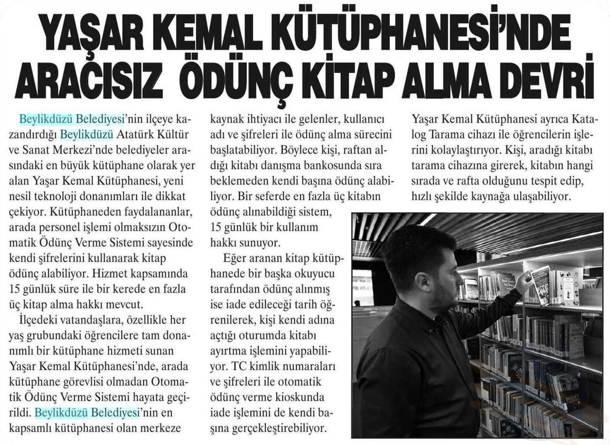 22 Haziran 2018 tarihli "YURT HABER" gazetesi. Beylikdüzü Belediyesi'nin ilçeye kazandırdığı Beylikdüzü Atatürk Kültür ve Sanat Merkezi'nde belediyeler arasındaki en büyük kütüphane olarak yer alan Yaşar Kemal Kütüphanesi, yen nesil teknoloji donanımları ile dikkat çekiyor. Kütüphaneden faydalananlar, arada personel işlemi olmaksızın Otomatik Ödünç Verme Sistemi sayesinde kendi şifrelerini kullanarak kitap ödünç alabiliyor.
