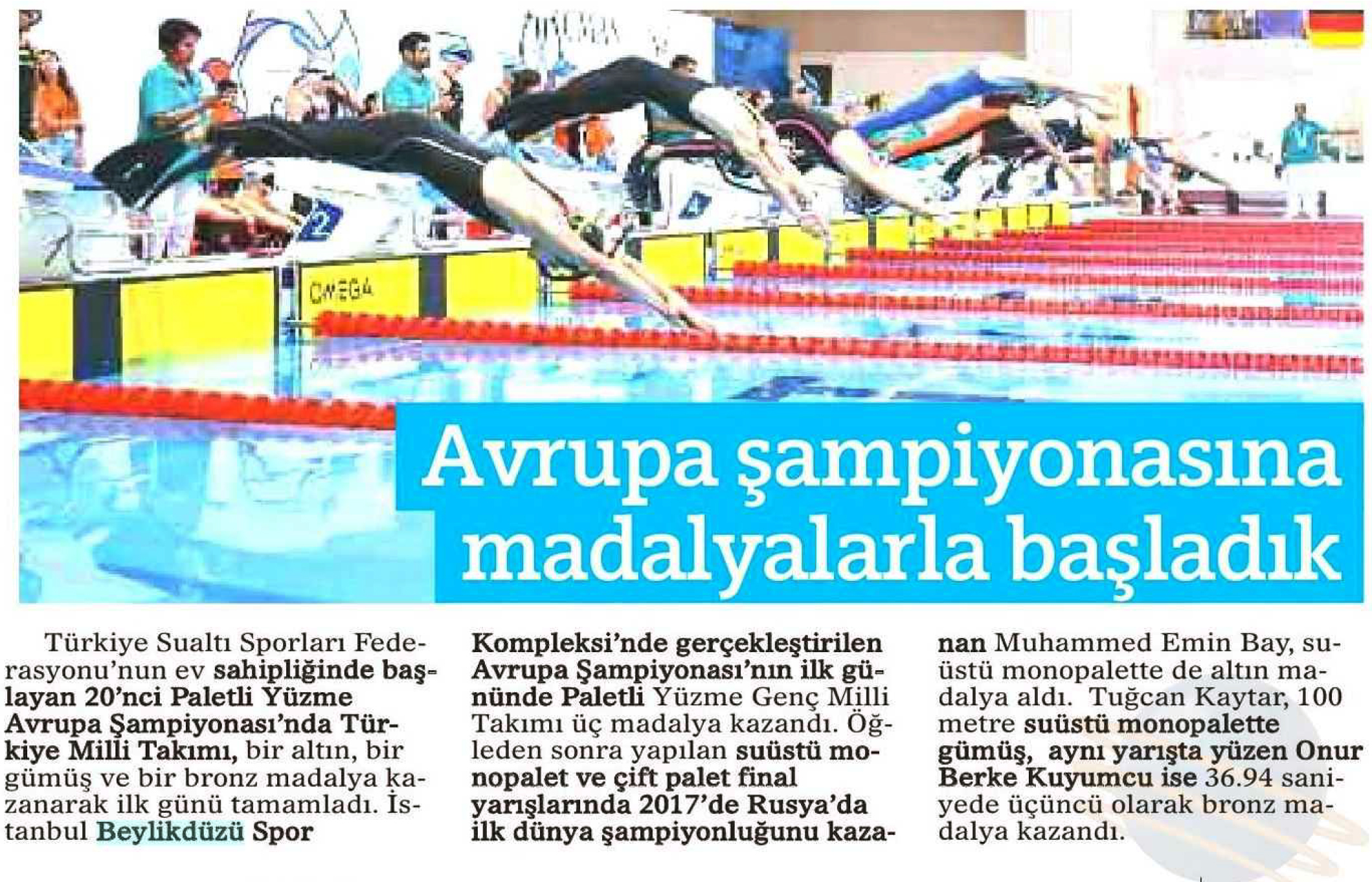 1 Ağustos 2018 tarihli "BURSA HAKİMİYET" gazetesi. Türkiye Sualtı Sporları Fedarasyonu'nun evsahipliğinde başlayan 20'nci Paletli Yüzme Avrupa Şampiyonası Beylikdüzü Spor Kompleksinde gerçekleştirildi.Şampiyonanın ilk günününde Türkiye Genç Milli Takımı 3 madalya kazandı.