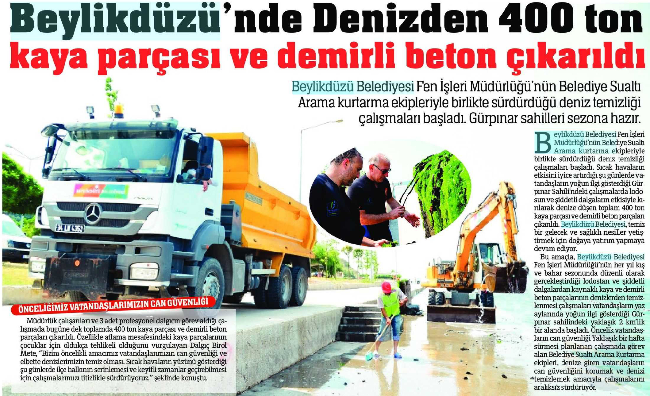 27 Temmuz 2018 tarihli "3. BÖLGE" gazetesi. Beylikdüzü Belediyesi Fen İşleri Müdürlüğü'nün Belediye Sualtı Arama kurtarma ekipleriyle birlikte sürdürdüğü deniz temizliği çalışmaları başladı. Gürpınar sahilleri sezona hazır.