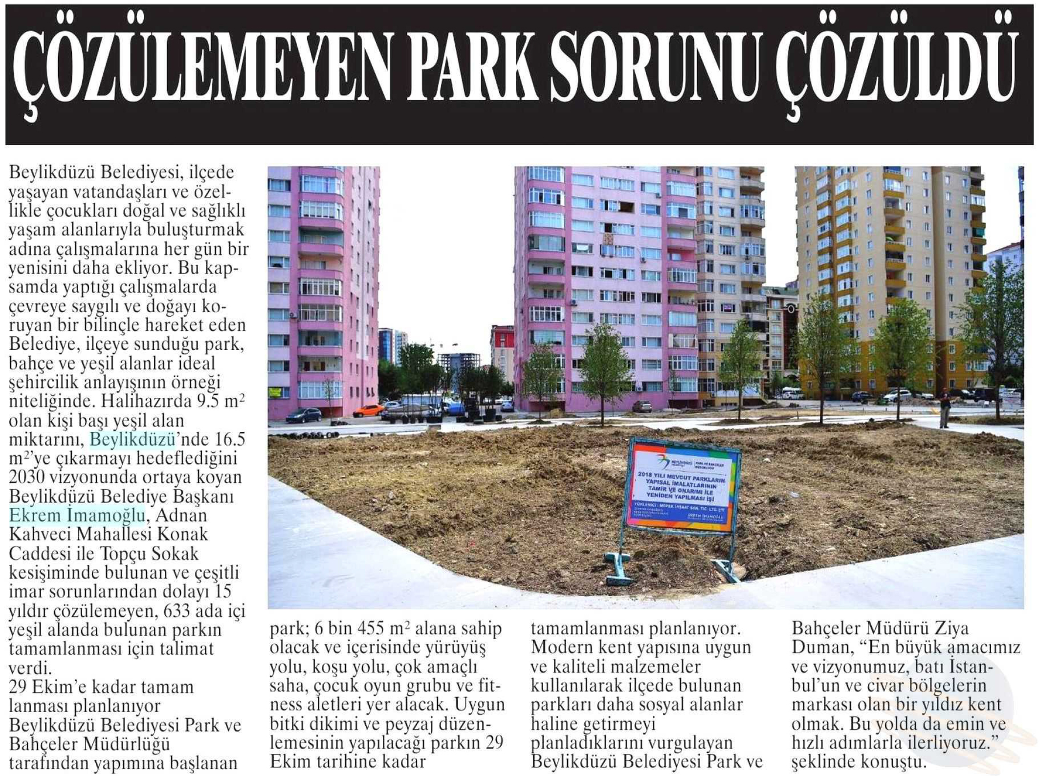 7 Ağustos 2018 tarihli "NABIZ" gazetesi. Beylikdüzü Belediyesi, ilçede yaşayan vatandaşları ve özelllikle çocukları doğal ve sağlıklı yaşam alanlarıyla buluşturmak adına çalışmalarına her gün bir yenisini daha ekliyor. Halihazırda 9.5 m2 olan kişi başı yeşil alan miktarını Beylikdüzü'nde 16.5 m2 ye çıkarmayı hedeflediğini 2030 vizyonunda ortaya koyan Beylikdüzü Belediye Başkanı Ekrem İmamoğlu, Adnan Kahveci Mahallesi Konak Caddesi ile Topçu Sokak kesişiminde bulunan ve çeşitli imar sorunlarından dolayı çözülemeyen 633 ada içi yeşil alanda bulunan parkın tamamlanması için talimat verdi. Parkın 29 Ekim tarihine kadar tamamlanması planlanıyor.