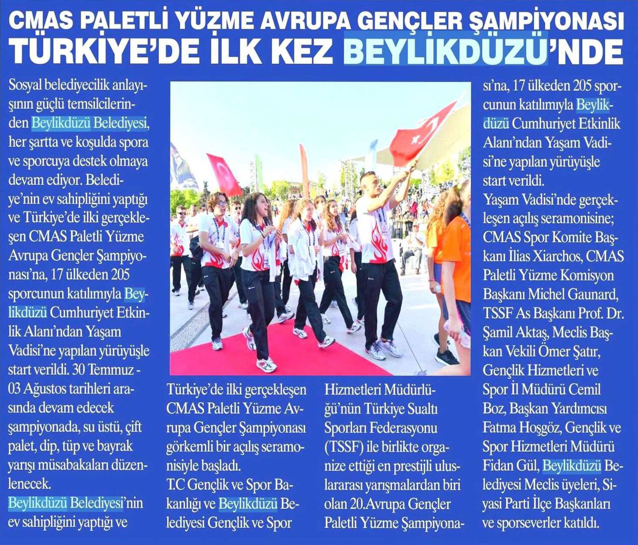 31 Temmuz 2018 tarihli "ZEYNA" gazetesi. Beylikdüzü Belediyesinin ev sahipliğini yaptığı ve Türkiye'de ilki gerçekleşen CMAS Paletli Yüzme Avrupa Gençler Şampiyonası'na 17 ülkeden 205 sporcunun katılımıyla Beylikdüzü Cumhuriyet Etkinlik Alanı'ndan Yaşam Vadisi'ne yapılan yürüyüşle start verildi.