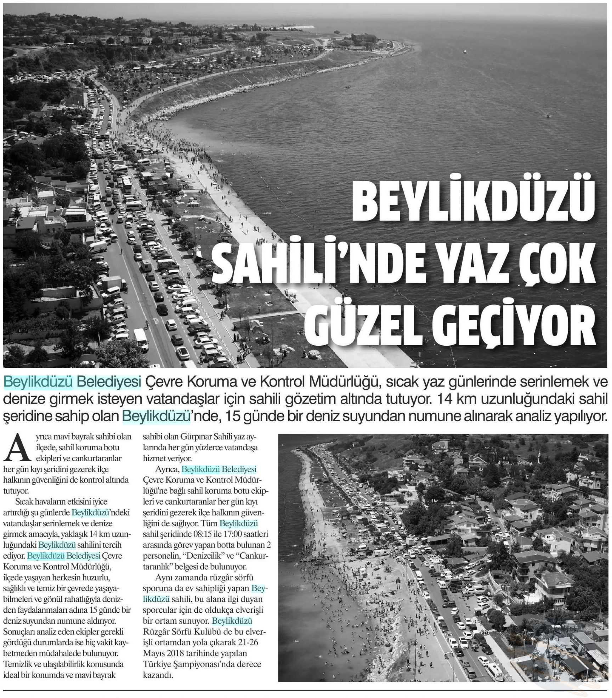 9 Ağustos 2018 tarihli "HABER EKSPRESS" gazetesi. Beylikdüzü Belediyesi Çevre Koruma ve Kontrol Müdürlüğü, sıcak yaz günlerinde serinlemek ve denize girmek isteyen vatandaşları için sahili gözetim altında tutuyor. 14 km uzunluğundaki sahil şeridine sahip olan Beylikdüzü'nde, 15 günde bir deniz suyunda numene alınarak analiz yapılıyor. Sonuçları analiz eden ekipler gerekli göerdüğü durumlarda ise hiç vakit kaybetmeden müdahalede bulunuyor. Temizlik ve ulaşılabilirlik konusunda ideal bir konumda vee mavi bayrak sahibi olan Gürpınar Sahili yaz aylarında her gün yüzlerce vatandaşa hizmet veriyor.