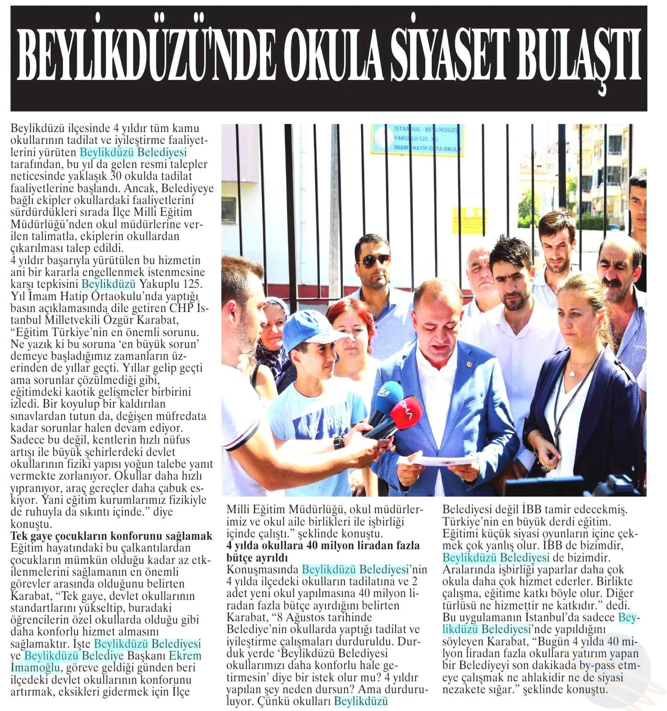 10 Ağustos "NABIZ" gazetesi. Okulların yeni döneme hazırlanması için badana boya işlemlerini yapan Beylikdüzü Belediyesi'nin İlçe Milli Eğitim Müdürlüğü tarafından bilinçli olarak el çektirildiğini ifade eden CHP'li Özgür Karabat "Okullar siyasete alet ediliyor" dedi. İBB'nin tüm okulları boyması nedeniyle belediyeye izin verilmediği öğrenildi.