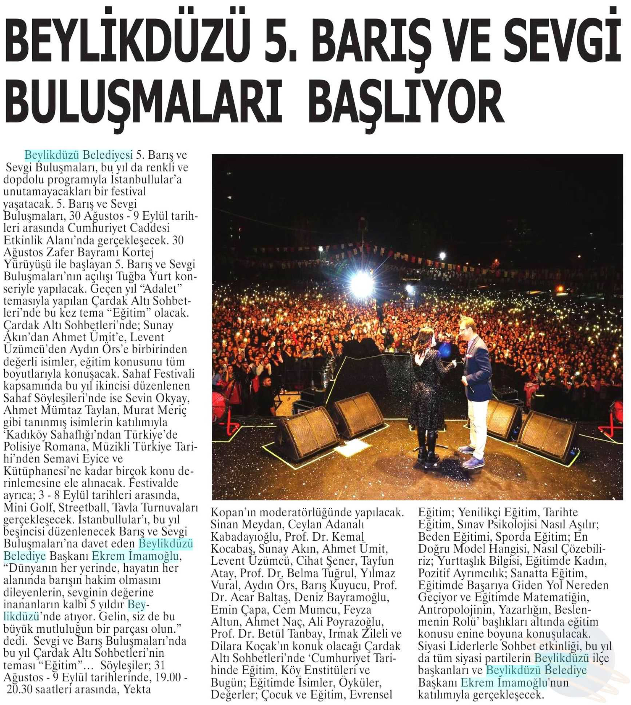 29 Ağustos 2018 tarihli "NABIZ" gazetesi. 5. Barış ve Sevgi Buluşmaları, 30 Ağustos - 9 Eylül tarihleri arasında Cumhuriyet Caddesi Etkinlik Alanı'nda gerçekleşecek. 30 Ağustos Zafer Bayramı Kortej yürüyüşü ile başlayan 5. Barış ve Sevgi Buluşmaları'nın açılışı Tuğba Yurt konseriyle yapılacak. Geçen yıl "Adalet" temasıyla yapılan Çardak Altı Sohbetleri'nde; Sunay Akın'dan Ahmet Ümit'e, Levent Üzümcü'den Aydın Örs'e birbirinden değerli isimler, eğitim konusunu tüm boyutlarıyla konuşacak.
