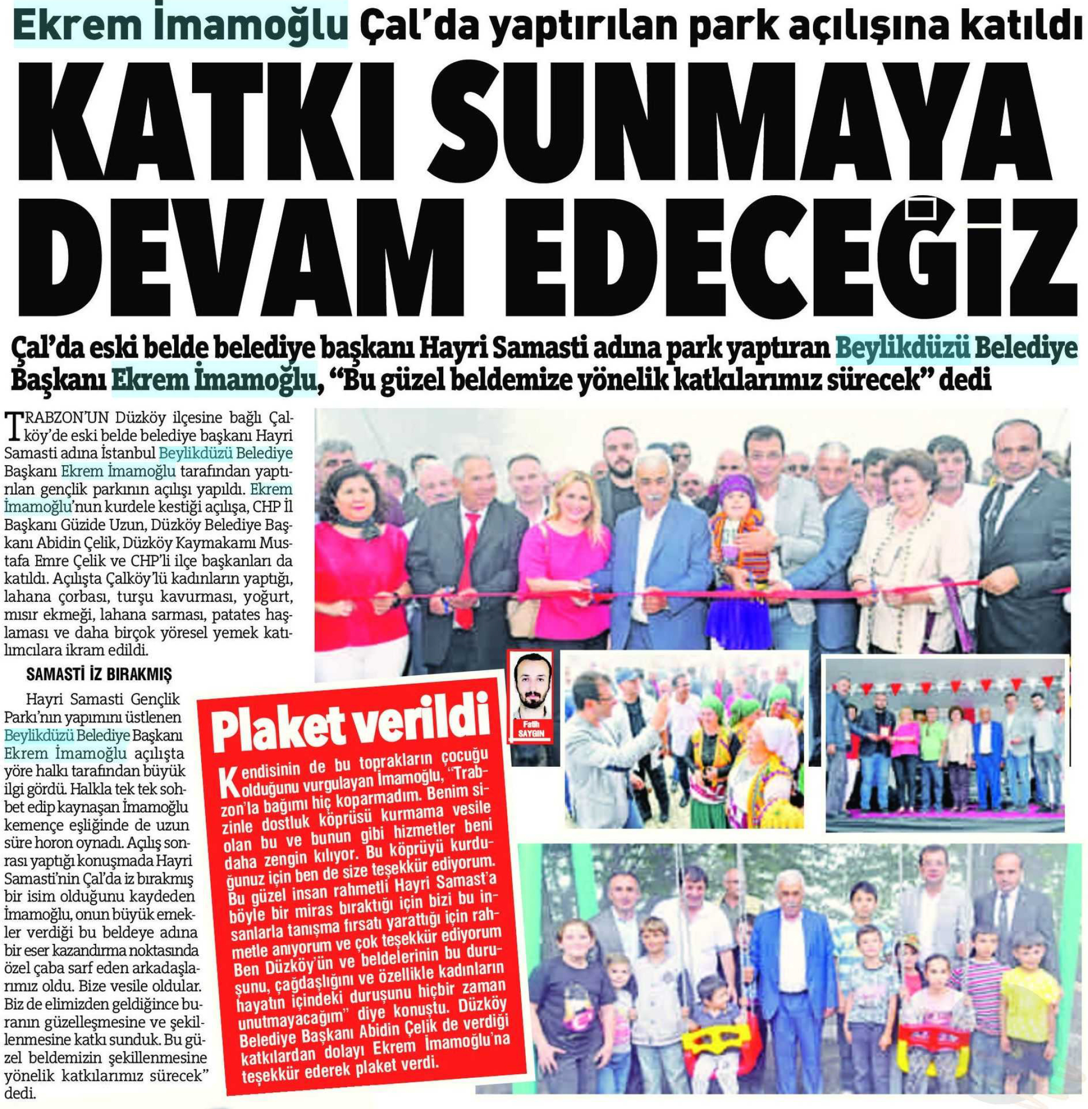 18 ağustos 2018 tarihli "KARADENİZ'DE SON NOKTA" gazetesi. Trabzon Düzköy ilçesine bağlı Çalköy'de eski belediye başkanı Hayri Samasti adına İstanbul Beylikdüzü Belediye Başkanı Ekrem İmamoğlu tarafından yaptırılan gençlik parkının açılışı yapıldı. Ekrem İmamoğlu'nun kurdela kestiği açılışa, CHP İl Başkanı Güzide Uzun, Düzköy Belediye Başkanı Abidin Çelik, Düzköy Kaymakamı Mustafa Emre Çelik ve CHP'li ilçe başkanları da katıldı.