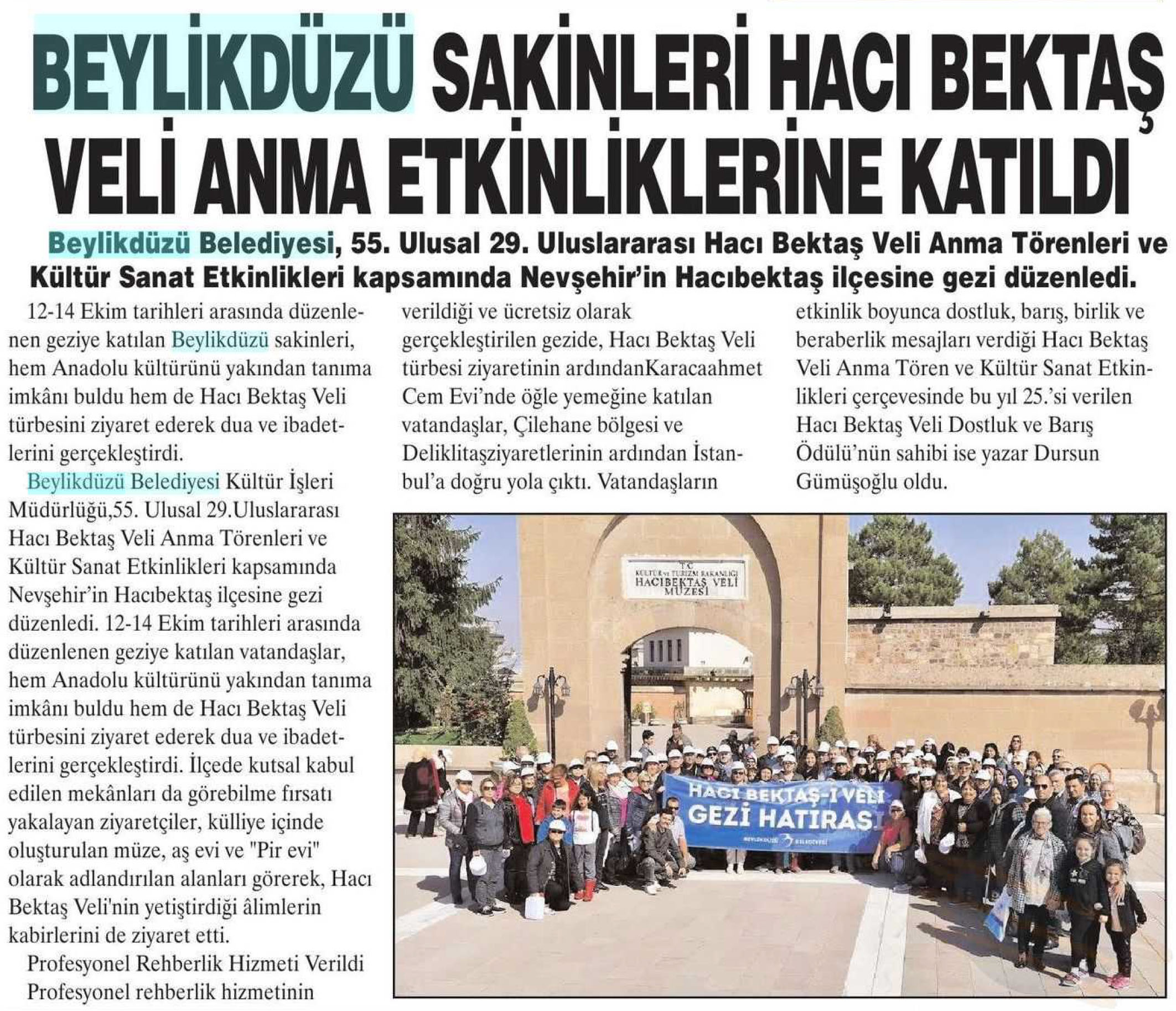 18 Ekim 2018 tarihli "YURTHABER" gazetesi. Beylikdüzü Belediyesi, 55. Ulusal 29. Uluslararası Hacı Bektaş Veli Anma Törenleri ve Kültür Sanat Etkinlikleri kapsamında Nevşehir'in Hacıbektaş ilçesine gezi düzenledi.