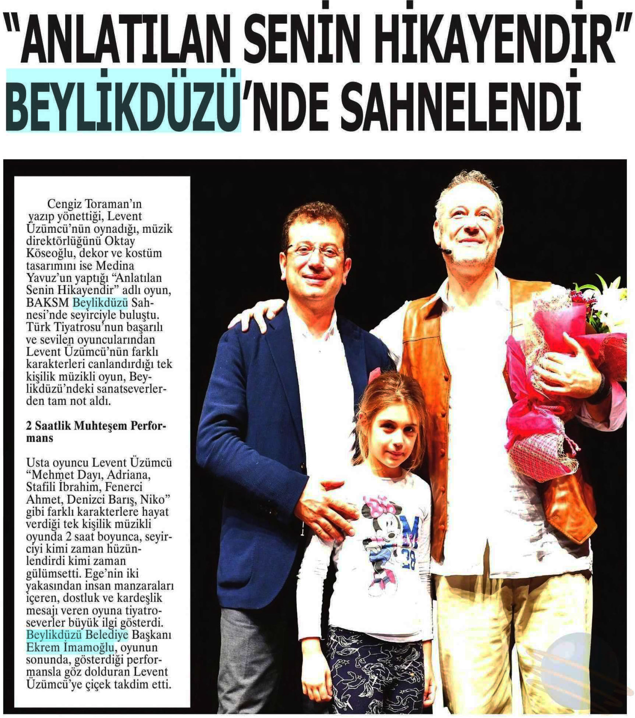 6 Kasım 2018 tarihli "NABIZ" gazetesi . Cengiz Toraman'ın yönettiği Levent Üzümcü'nün oynadığı "Anlatılan Senini Hikayendir" adlı oyun BAKSM Beylikdüzü Sahnesi'nde seyirciyle buluştu.