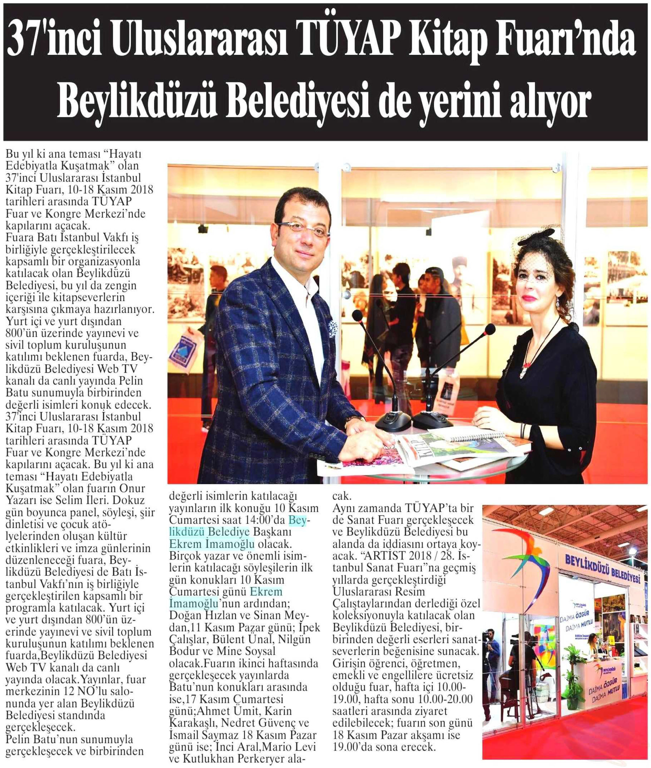 9 Kasım 2018 tarihli "NABIZ" gazetesi. Bu yıl ki ana teması" Hayatı Edebiyatla Kuşatmak" olan 37'inci Uluslararası İstanbul Kitap Fuarına Batı İstanbul Vakfı işbirliğiyle gerçekleştirilecek kapsamlı bir organizasyonla katılacak olan Beylikdüzü Belediyesi, bu yıl da zengin içeriğiyle kitapseverlerin karşısına çıkmaya hazırlanıyor.