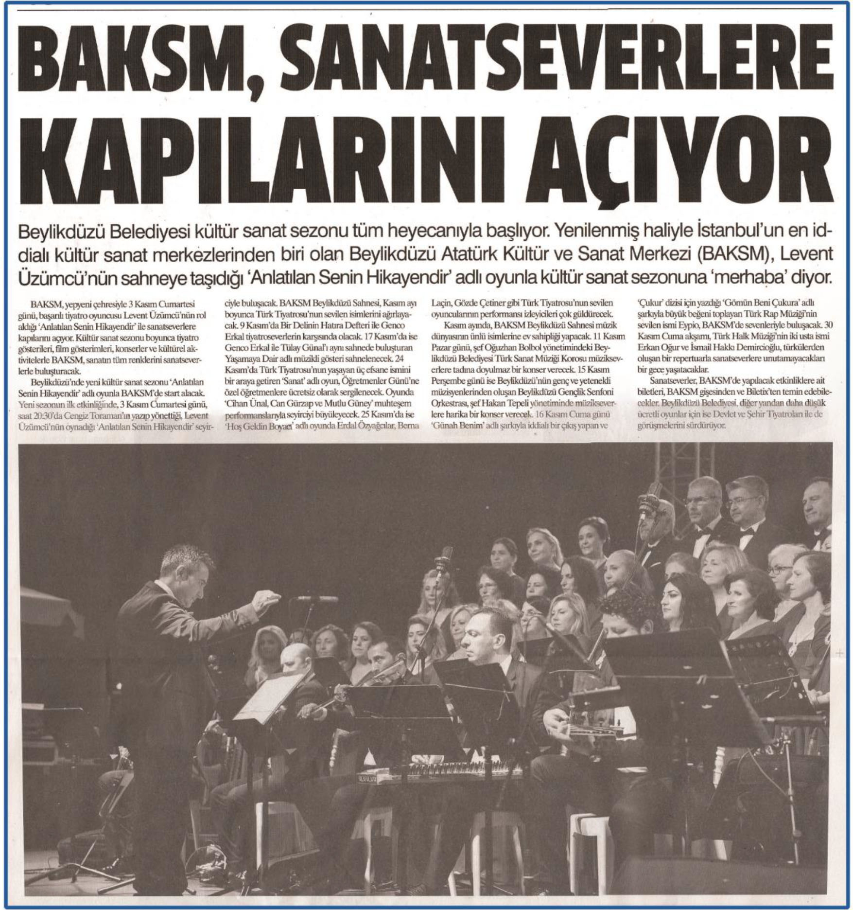 6 Kasım 2018 tarihli "METROPOL" gazetesi. Beylikdüzü Belediyesi kültür sanat sezonu tüm heyecanıyla başlıyor. Yenilenmiş haliyle İstanbul'un en iddialı kültür sanat merkezlerinden biri olan Beylikdüzü Atatürk Kültür ve Sanat Merkezi (BAKSM) Levent Üzümcü'nün sahneye taşıdığı "Anlatılan Senin Hikayendir" adlı oyunla kültür sanat sezonuna 'merhaba'diyor.