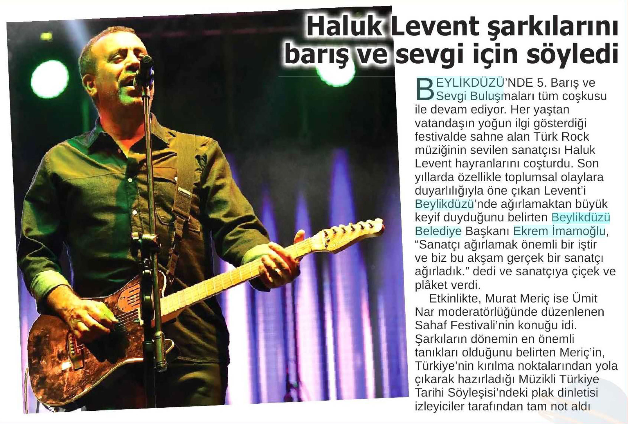 10 Eylül 2018 tarihli "24 SAAT" gazetesi. Beylikdüzü'nde 5. Barış ve Sevgi Buluşmaları tüm coşkusu ile devam ediyor. Her yaştan vatandaşın yoğun ilgi gösterdiği festivalde sahne alan Türk Rock müziğinin sevilen sanatçısı Haluk Levent hayranlarını coşturdu.