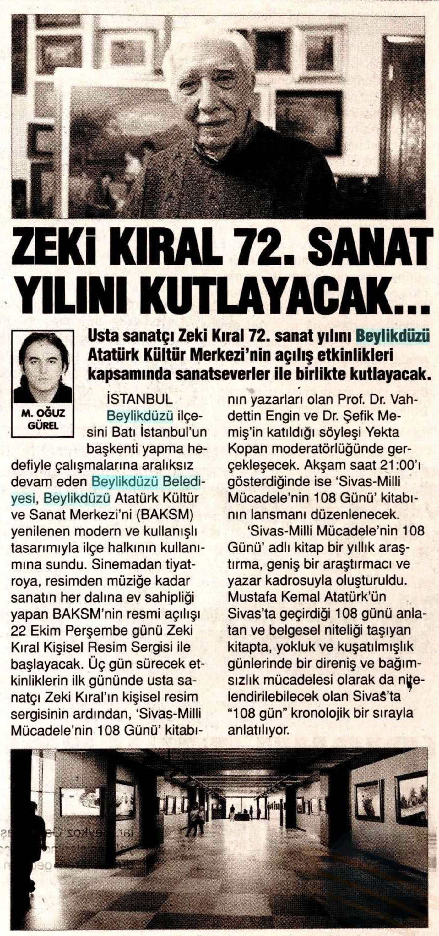 9 Kasım 2018 tarihli "ÖNCE VATAN" gazetesi. Usta sanatçı Zeki Kıral 72. sanat yılını Beylikdüzü Atattürk Kültür Merkezi'nin açılış etkinlikleri kapsamında sanatseverler ile birlikte kutlayacak.