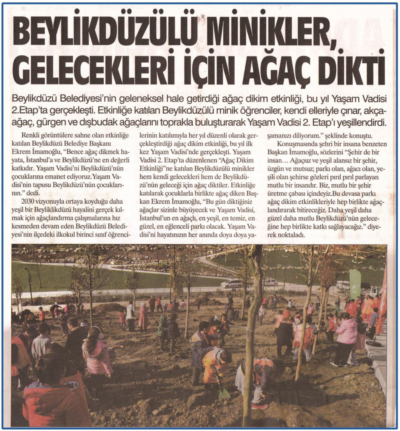 14 Kasım 2018 tarihli "TEKİN HABER" gazetesi. Beylikdüzü Belediyesi'nini geleneksel hale getirdiği ağaç dikim etkinliği, bu yıl Yaşam Vadisi 2. Etap'ta gerçekleşti. Etkinliğe katılan Beylikdüzülü minik öğrenciler, kendi elleriyle çınar, akçaağaç, gürgen ve dişbudak ağaçlarını toprakla buluştururarak Yaşam Vadisi 2. Etap'ı yeşillendirdi.