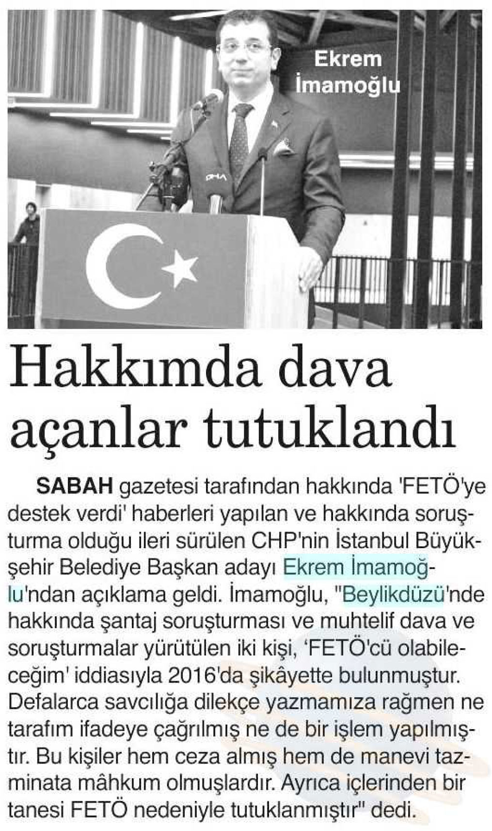22 Aralık 2018 tarihli "İZMİR 9 EYLÜL" gazetesi. Sabah gazetesi tarafından hakkında 'FETÖ'ye destek verdi' haberleri yapılan ve hakkında soruşturma olduğu ileri sürülen CHP'nin İstanbul Büyükşehir Belediye Başkan adayı Ekrem İmamoğlu'ndan açıklama geldi.