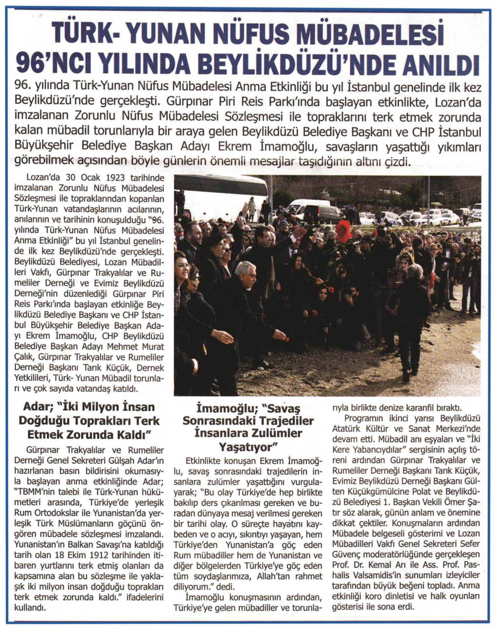 8 Şubat 2019 tarihli "SES" gazetesi. 96. yılında Türk- Yunan Nüfus Mübadelesi Anma Etkinliği bu yıl İstanbul genelinde ilk kez Beylikdüzü'nde gerçekleşti. Gürpınar Piri Reis Parkı'nda başlayan etkinlikte, Lozan'da imzalanan Zorunlu Nüfus Mübadelesi Sözleşmesi ile topraklarını terk etmek zorunda kalan mübadil torunlarıyla bir araya gelen Beylikdüzü Belediye Başkanı ve CHP istanbul Büyükşehir Belediye Başkan Adayı Ekrem İmamoğlu, savaşların yaşattığı yıkıları görebilmek açısından böyle günlerin önemli mesajlar taşıdığının altını çizdi.