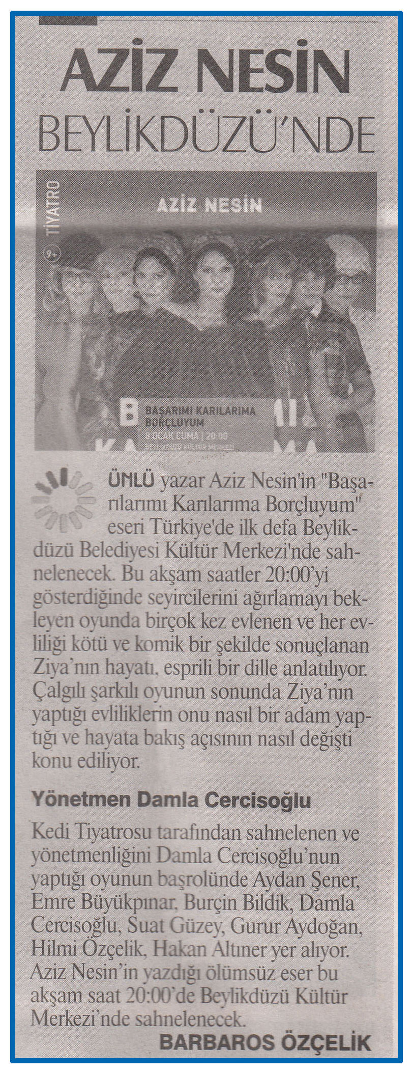 8 Ocak 2016 tarihli "GAZETE İSTANBUL" gazetesi. Bu akşam saat 20:00'yi gösterdiğinde seyircilerini ağırlamayı bekleyen oyunda birçok kez evlenen ve her evliliği kötü ve komik bir şekilde sonuçlanan Ziya'nın hayatı, esprili bir dille anlatılıyor.