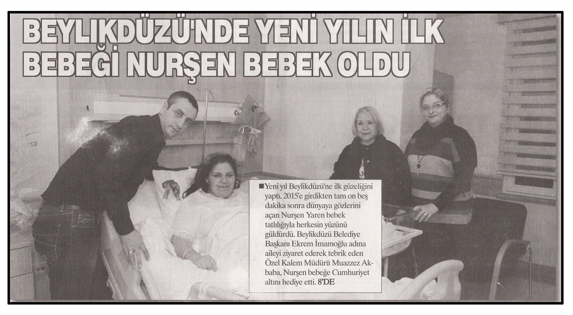 2 Ocak 2015 tarihli ''HABER EKSPRESS'' gazetesi. Yeni yıl Beylikdüzü'ne ilk güzelliğini yaptı. 2015'e girdikten tam on beş dakika sonra dünyaya gözlerini açan Nurşen Yaren, tatlılığıyla herkesin yüzünü güldürdü.