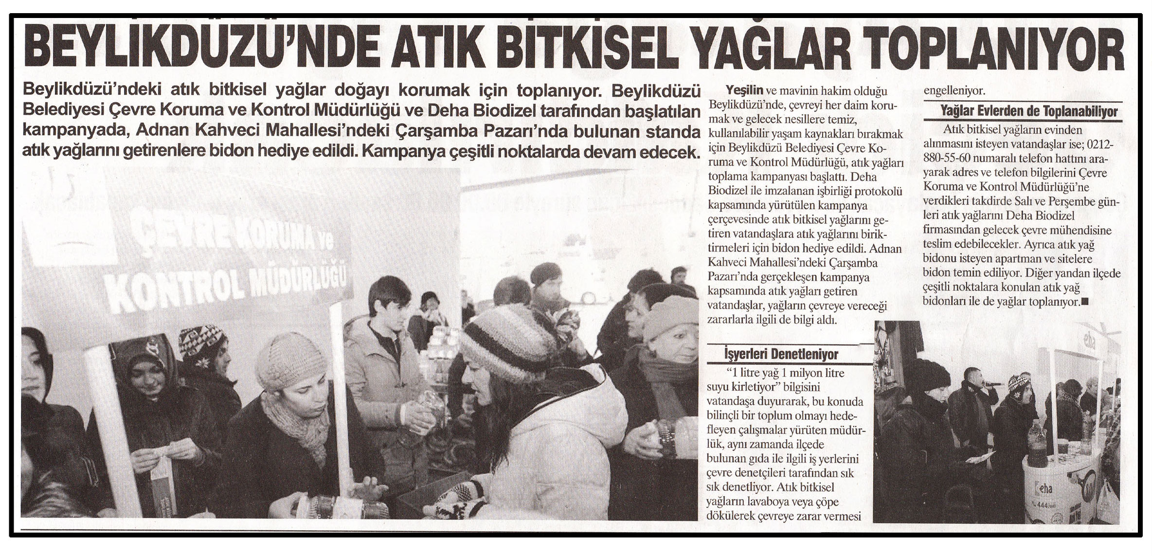 2 Ocak 2015 tarihli ''HABER EKSPRESS'' gazetesi. Beylikdüzü'ndeki atık bitkisel yağlar doğayı korumak için toplanıyor. Beylikdüzü Belediyesi Çevre Koruma ve Kontrol Müdürlüğü ve Deha Biodizel tarafından başlatılan kampanyada, Adnan Kahveci Mahallesi'ndeki Çarşamba Pazarı'ndaki standa atık yağlarını getirenlere bidon hediye edildi. Kampanya çeşitli noktalarda devam edecek.