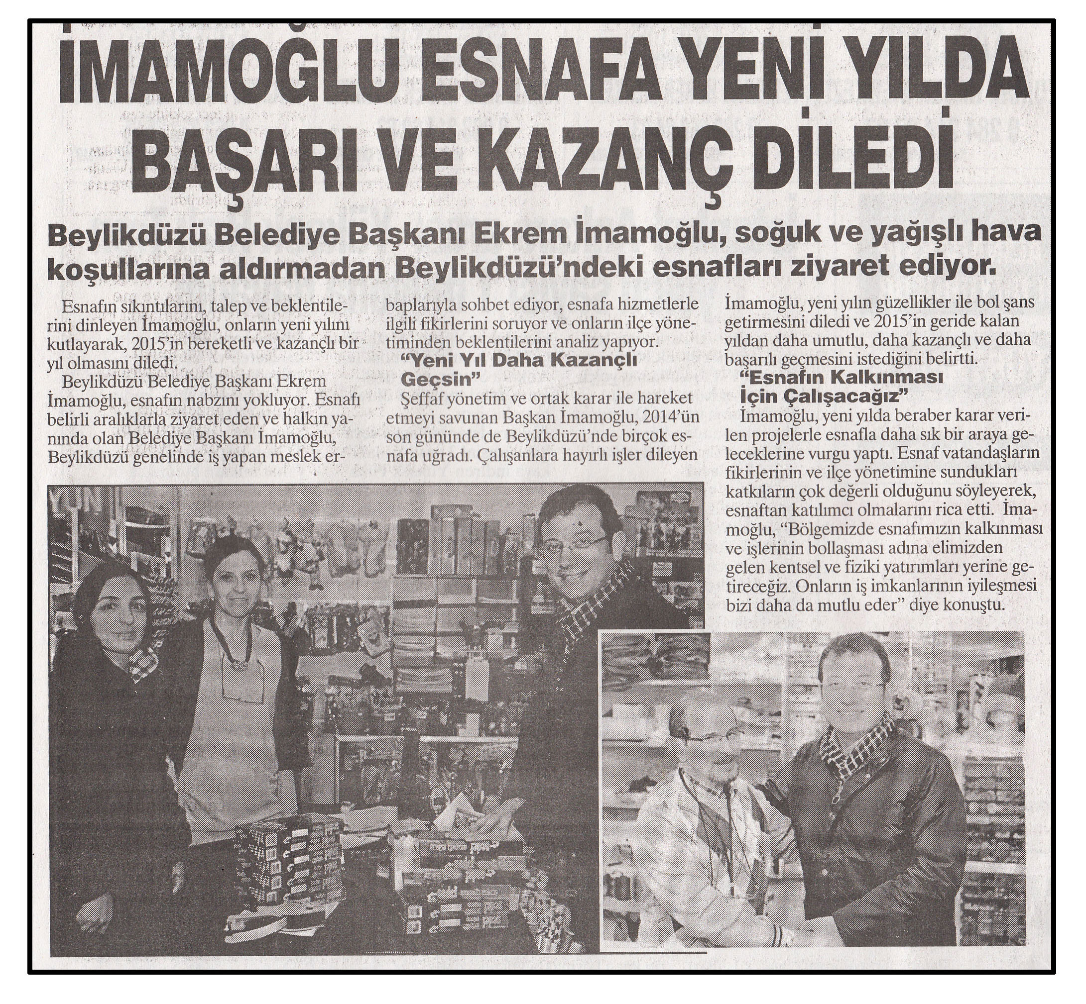 5 Ocak 2015 tarihli ''YURT HABER'' gazetesi. Beylikdüzü Belediye Başkanı Ekrem İmamoğlu, soğuk ve yağışlı hava koşullarına aldırmadan Beylikdüzü esnafını ziyaret ediyor.