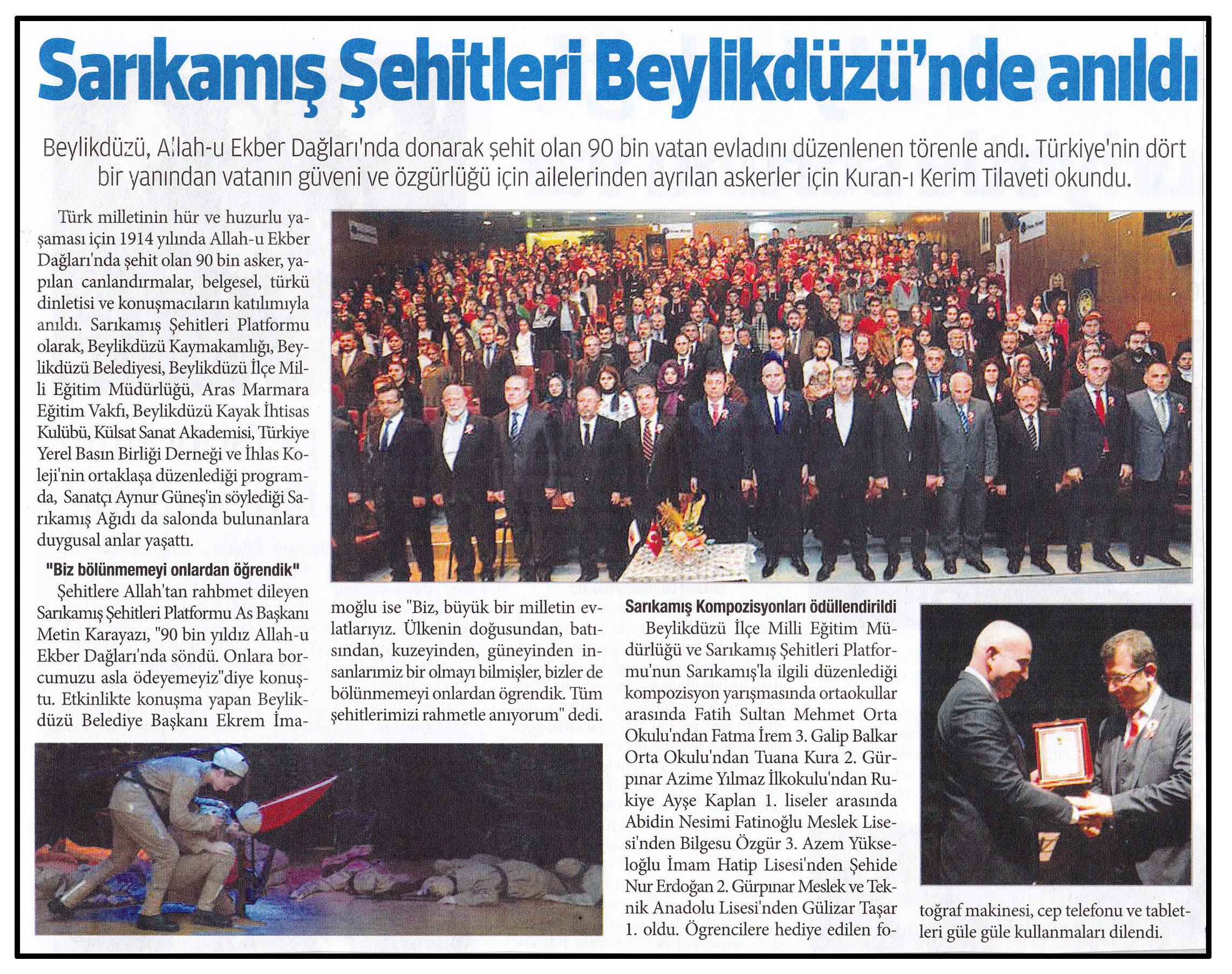 6 Ocak 2015 tarihli ''BİZİMYAŞAM'' gazetesi. Beylikdüzü, Allahüekber Dağları'nda donarak şehit olan 90 bin vatan evladını törenle andı. Vatan savunması uğruna genç yaşta hayata veda eden askerler için Kuran-ı Kerim okundu.