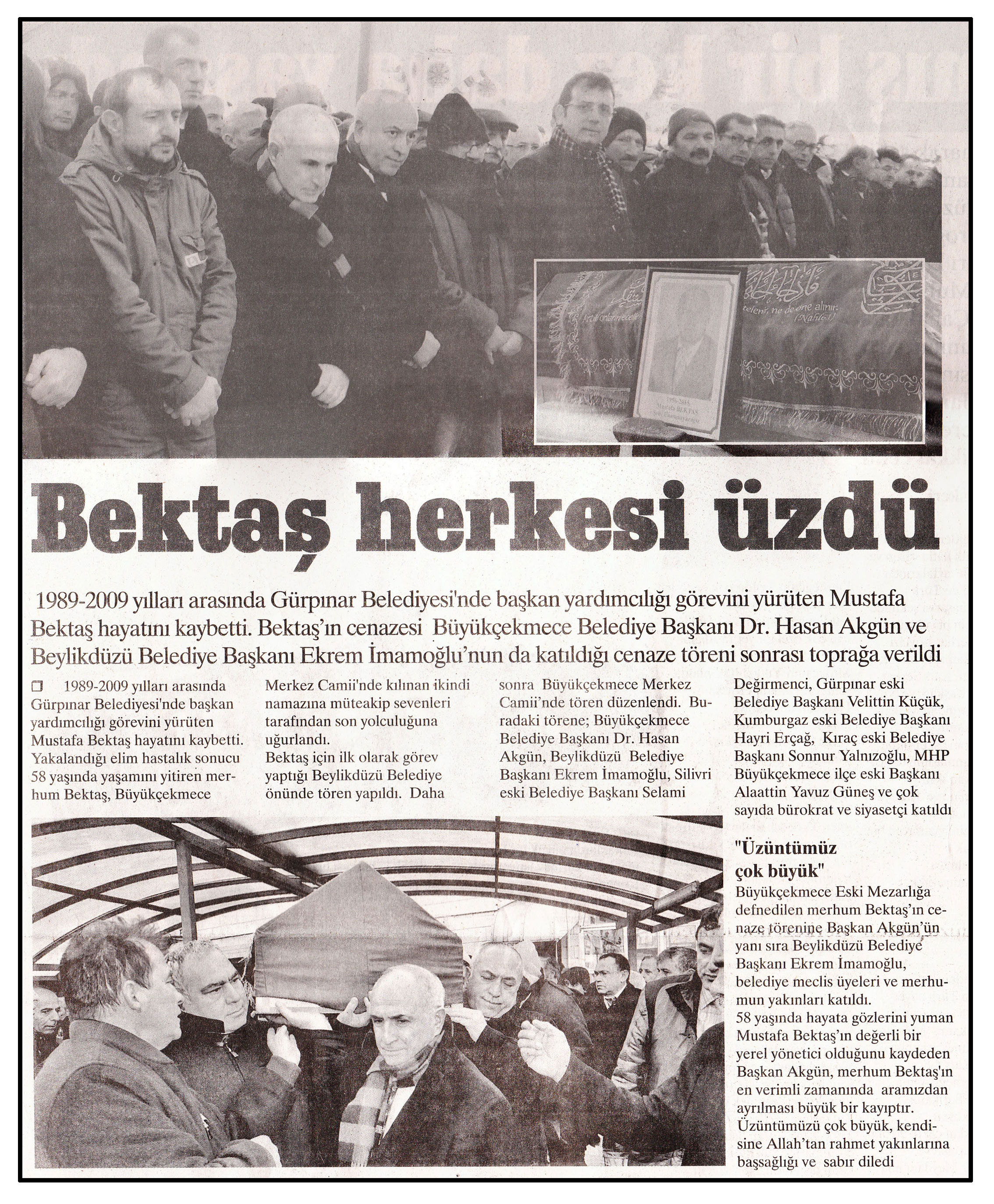 6 Ocak 2015 tarihli ''FARK GAZETESİ''. 1989-2009 yılları arasında Gürpınar Belediyesi'nde başkan yardımcılığı görevini yürüten Mustafa Bektaş hayatını kaybetti. Bektaş'ın cenazesi Büyükçekmece Belediye Başkanı Hasan Akgün ve Beylikdüzü Belediye Başkanı Ekrem İmamoğlu'nun da katıldığı törenle toprağa verildi.