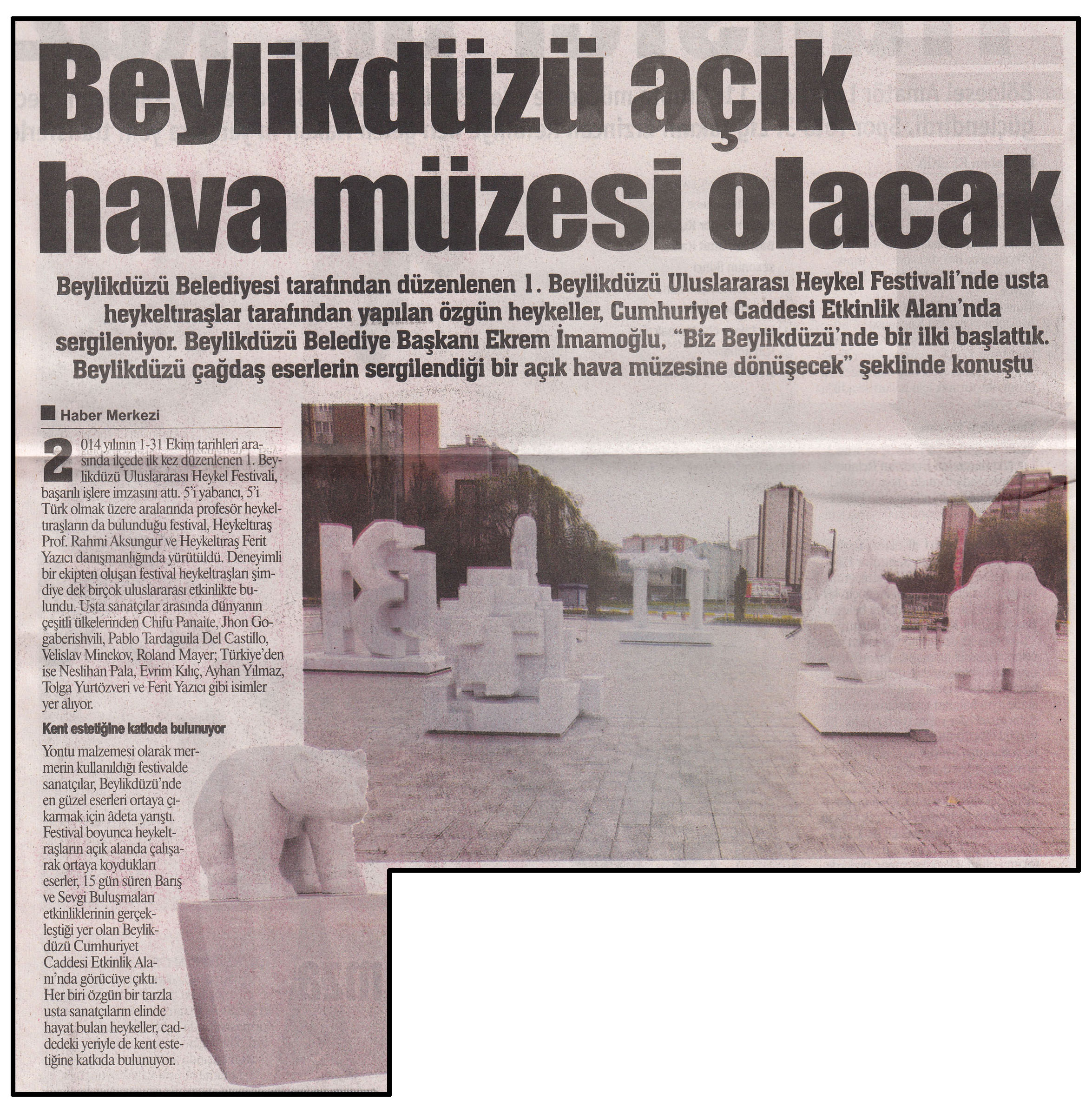 8 Ocak 2015 tarihli ''GAZETE İSTANBUL''. Beylikdüzü Belediyesi tarafından düzenlenen 1. Beylikdüzü Uluslararası Heykel Festivali'nde usta heykeltıraşlar tarafından yapılan özgün heykeller, Cumhuriyet Caddesi Etkinlik Alanı'nda sergileniyor.