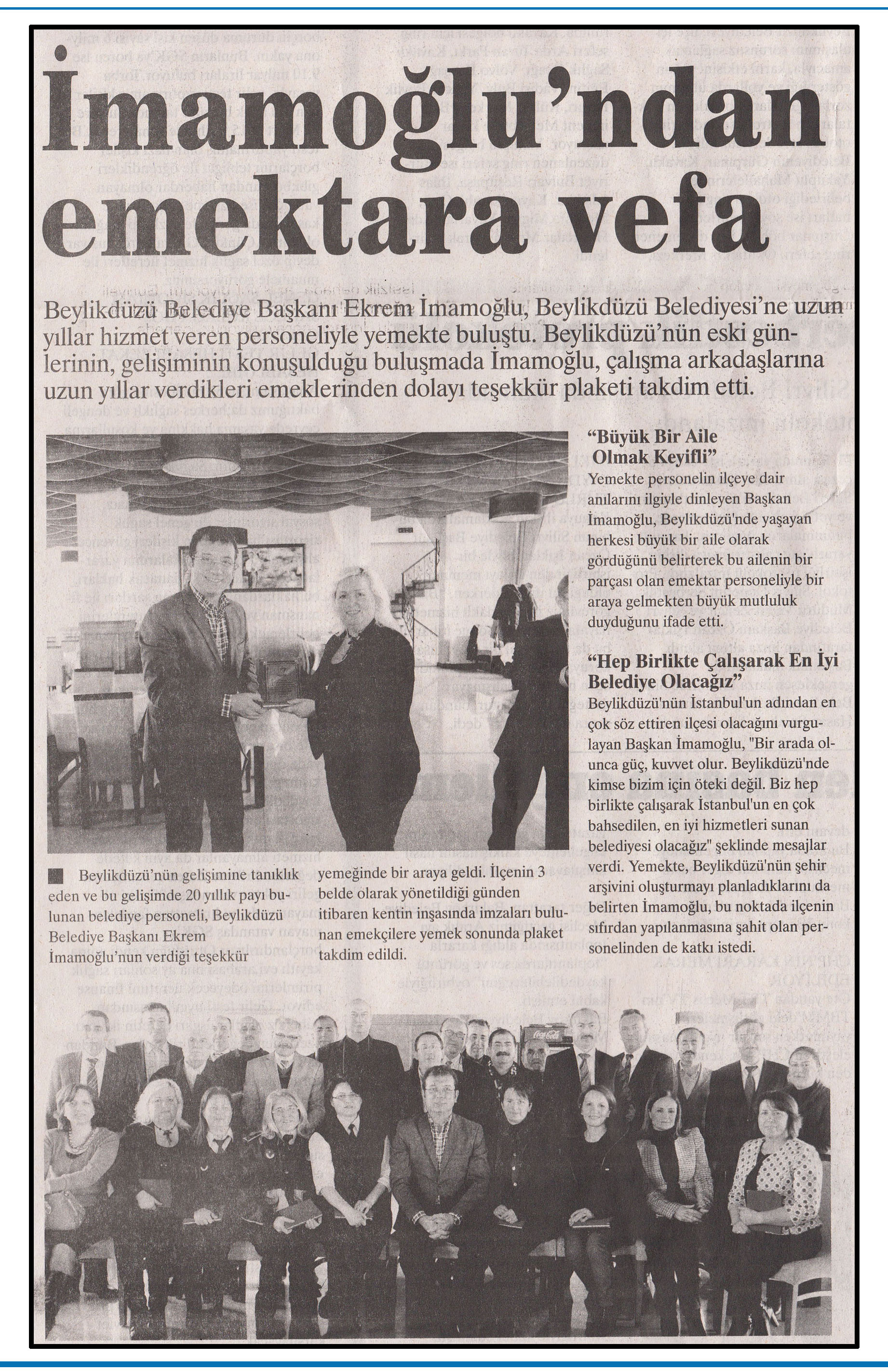 9 Ocak 2015 tarihli ''FARK GAZETESi'' gazetesi. Beylikdüzü Belediye Başkanı Ekrem İmamoğlu, Beylikdüzü Belediyesi'ne uzun yıllar hizmet veren personeliyle yemekte buluştu.Beylikdüzü'nün eski günlerinin,gelişiminin konuşulduğu buluşmada İmamoğlu,çalışma arkadaşlarına uzun yıllar verdikleri emeklerinden dolayı teşekkür plaketi takdim etti.