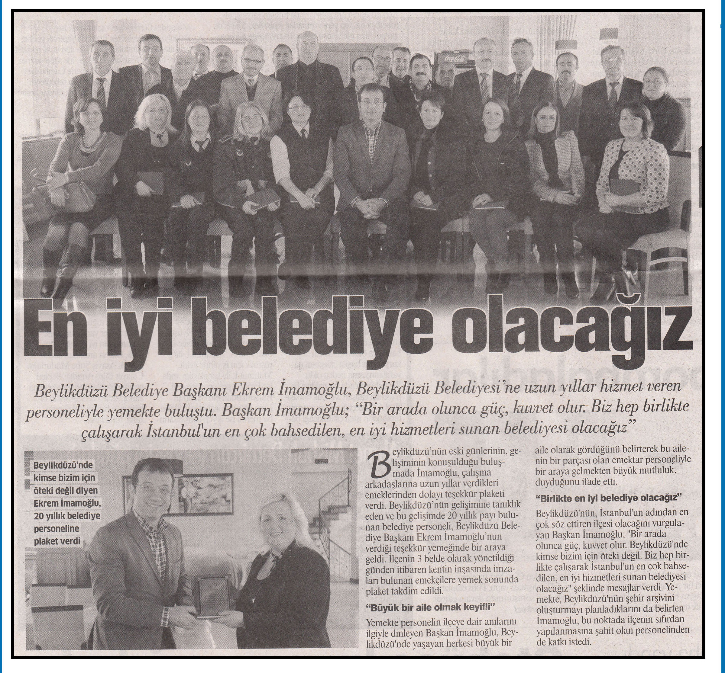 9 Ocak 2015 tarihli ''GAZETE İSTANBUL'' gazetesi. Beylikdüzü Belediye Başkanı Ekrem İmamoğlu, Beylikdüzü Belediyesi'ne uzun yıllar hizmet veren personeliyle yemekde buluştu. Başkan İmamoğlu; ''Bir arada olunca güç,kuvvet olur.Biz hep birlikte çalışarak İstanbul'un en çok bahsedilen,en iyi hizmetleri sunan belediye olacağız''
