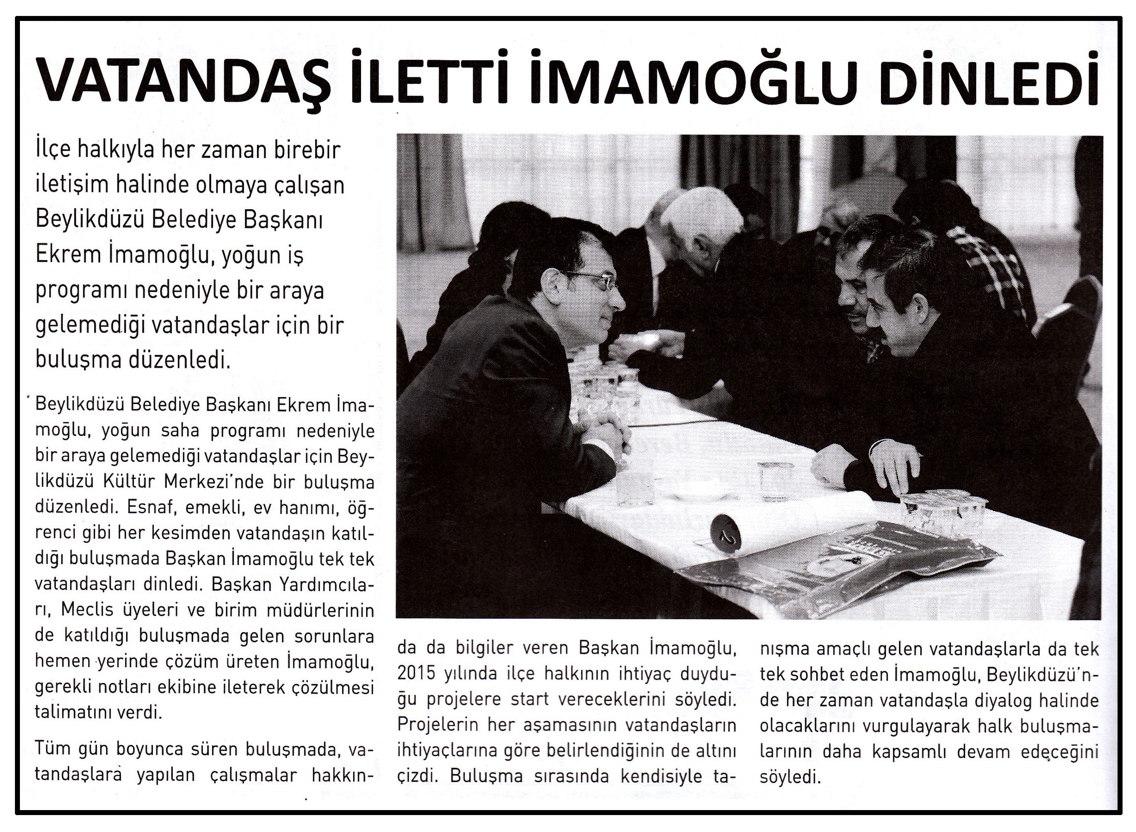 9 Ocak 2015 tarihli ''HABERVERİYORUM'' gazetesi. İlçe halkıyla her zaman birebir iletişim halinde olmaya çalışan Beylikdüzü Belediye Başkanı Ekrem İmamoğlu,yoğun iş programı nedeniyle bir araya gelemediği vatandaşlar için bir buluşma düzenledi.