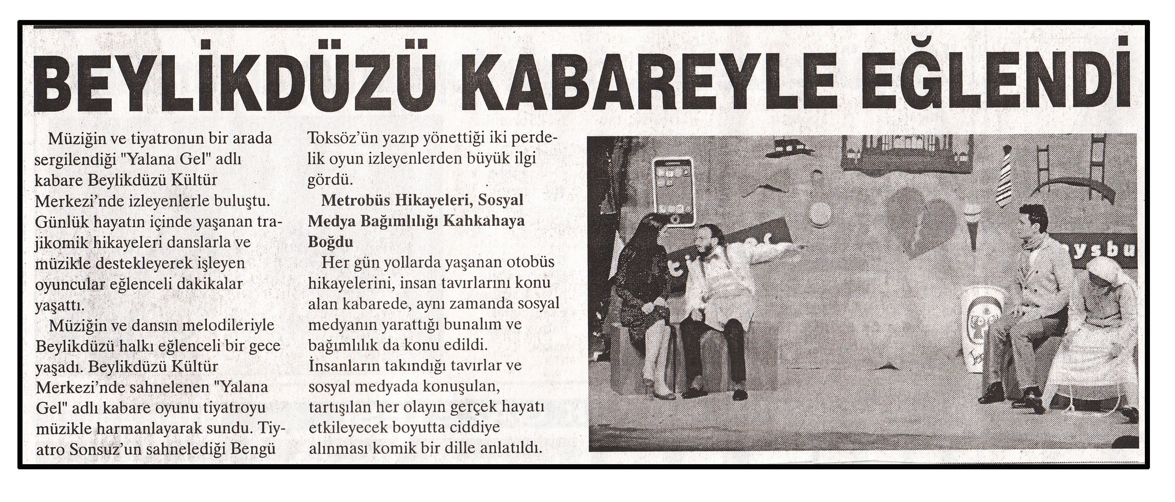 12 Ocak 2015 tarihli ''BÜYÜKÇEKMECE'' gazetesi. Müziğin ve tiyatronun bir arada sergilendiği ''Yalana Gel'' adlı kabare Beylikdüzü Kültür Merkezi'nde izleyenlerle buluştu.Günlük hayatın içinde yaşanan trajikomik hikayeleri danslarla ve müzik'le destekleyerek işleyen oyuncular eğlenceli dakikalar yaşattı.