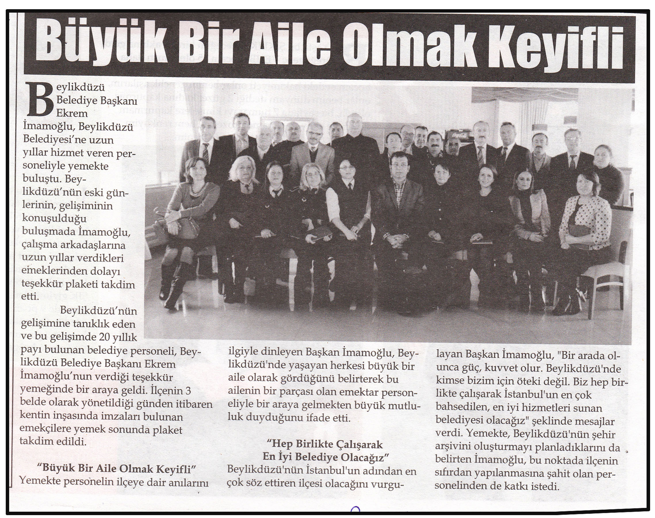 27 Ocak 2015 tarihli ''BEYLİKDÜZÜ'' gazetesi. Beylikdüzü Belediye Başkanı Ekrem İmamoğlu,Beylikdüzü Belediyesi'ne uzun yıllar hizmet veren personeliyle yemekte buluştu.