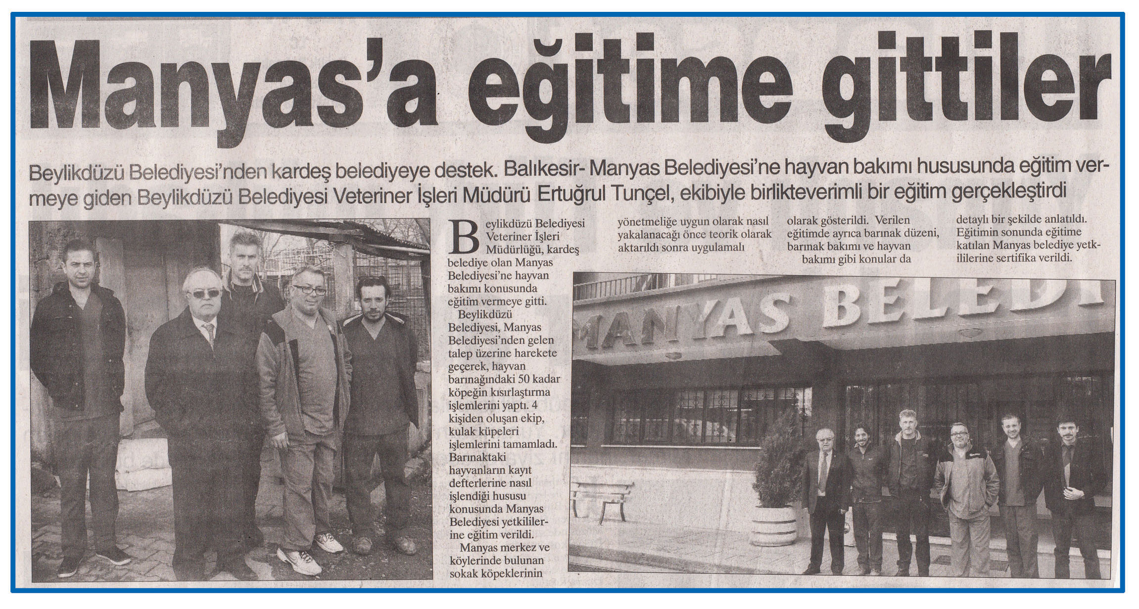 4 Mart 2015 tarihli ''MANŞET'' gazetesi. Beylikdüzü Belediyesi'nden kardeş belediyeye destek,Balıkesir-Manyas Belediyesi'ne hayvan bakımı hususunda eğitim vermeye giden Beylikdüzü Belediyesi Veteriner İşleri Müdürü Ertuğrul Tunçel,ekibiyle birlikte verimli bir eğitim gerçekleştirdi.