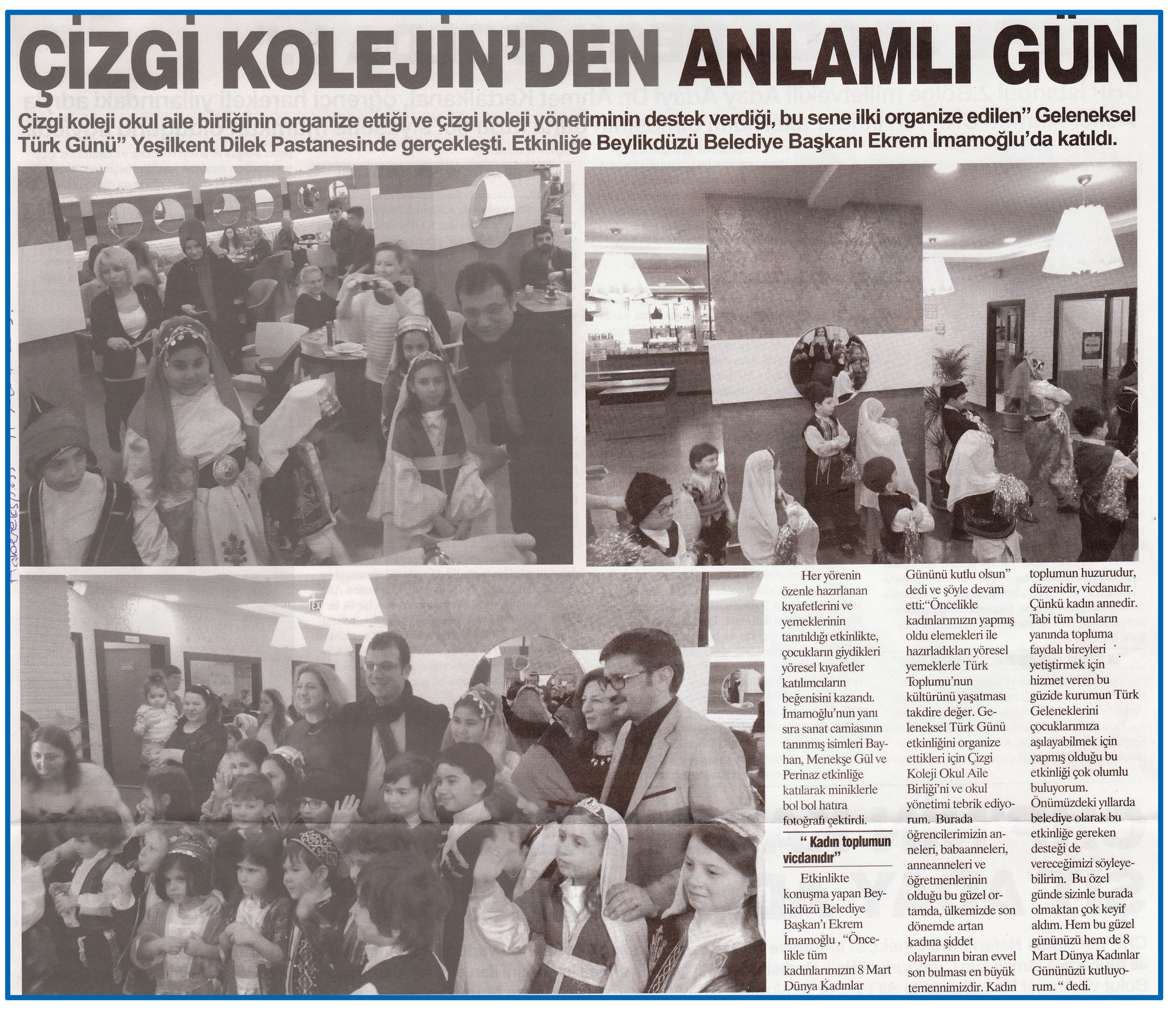 11 Mart 2015 tarihli ''HABER EKSPRESS'' gazetesi. Çizgi koleji okul aile birliğinin organize ettiği ve çizgi koleji yönetiminin destek verdiği,bu sene ilki organize edilen ''Geleneksel Türk Günü'' Yeşilkent Dilek Pastanesinde gerçekleşti.Etkinliğe Beylikdüzü Belediye Başkanı Ekrem İmamoğlu'da katıldı