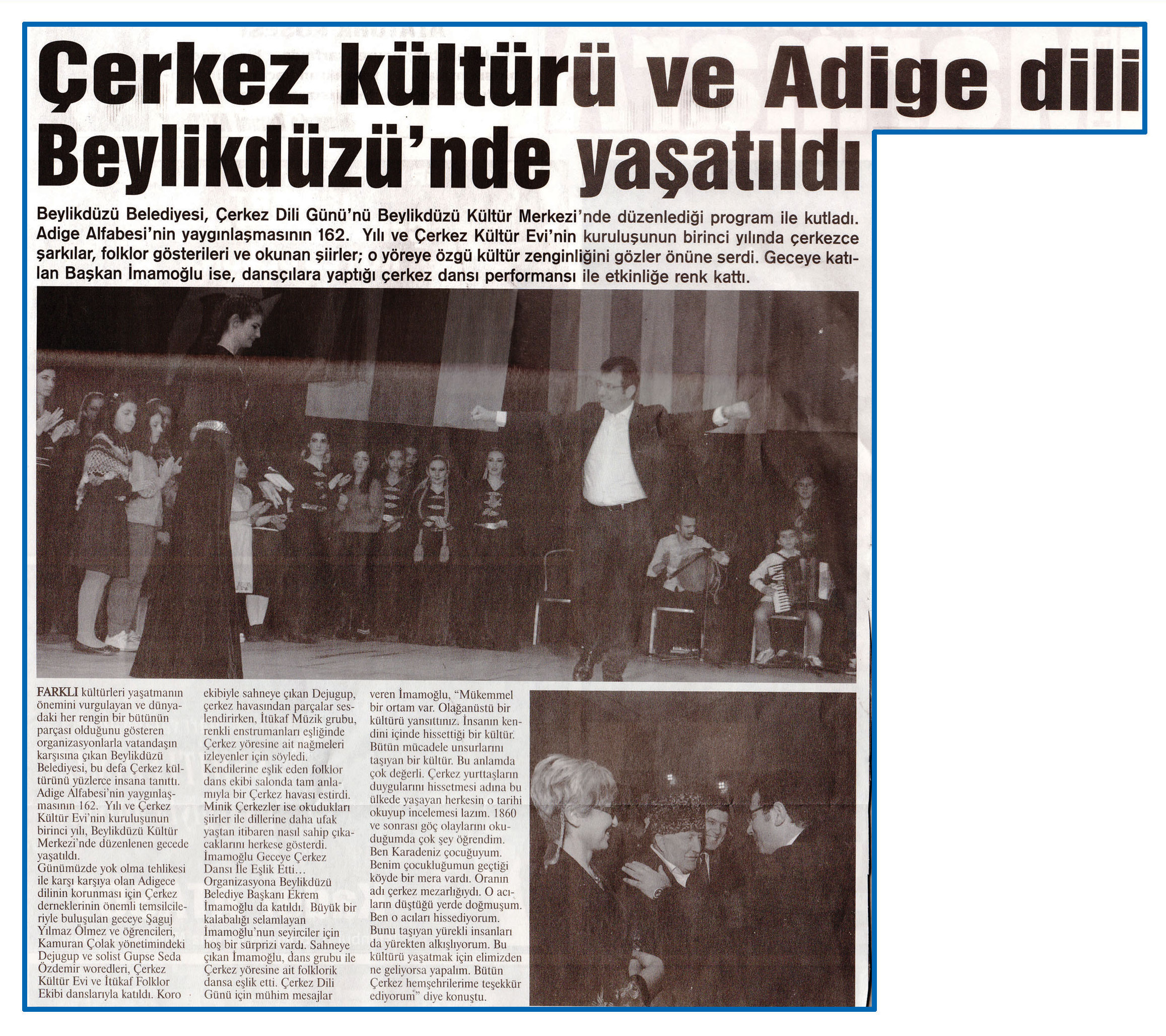 17 Mart 2015 tarihli ''MARMARA'' gazetesi. Beylikdüzü Belediyesi,Çerkez Dili Günü'nü Beylikdüzü Kültür Merkezi'nde düzenlediği program ile kutladı.Adige Alfabesi'nin yaygınlaşmasının 162. Yılı ve Çerkez Kültür Evi'nin kuruluşunun birinci yılında çerkezce şarkılar,folklor gösterileri ve okunan şiirler;o yöreye özgü kültür zenginliğini gözler önüne serdi. Geceye katılan Başkan İmamoğlu ise,dansçılara yaptığı çerkez dansı performansı ile etkinliğe renk kattı.