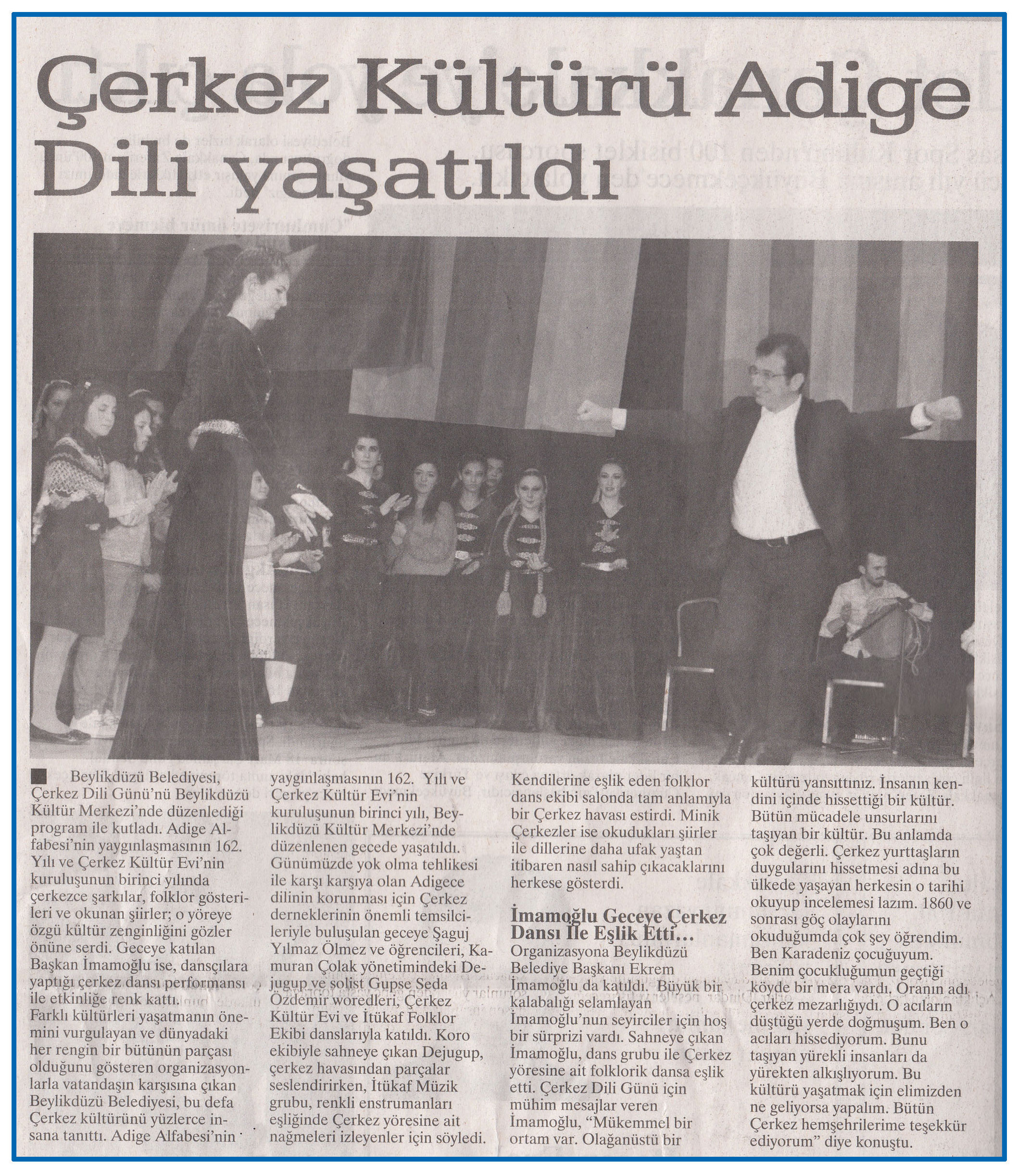 18 Mart 2015 tarihli ''FARK GAZETESİ'' gazetesi. Beylikdüzü Belediyesi,Çerkez Dili Günü'nü Beylikdüzü Kültür Merkezi'nde düzenlediği program ile kutladı.Adige Alfabesi'nin yaygınlaşmasının 162. Yılı ve Çerkez Kültür Evi'nin kuruluşunun birinci yılında çerkezce şarkılar,folklor gösterileri ve okunan şiirler;o yöreye özgü kültür zenginliğini gözler önüne serdi. Geceye katılan Başkan İmamoğlu ise,dansçılara yaptığı çerkez dansı performansı ile etkinliğe renk kattı.
