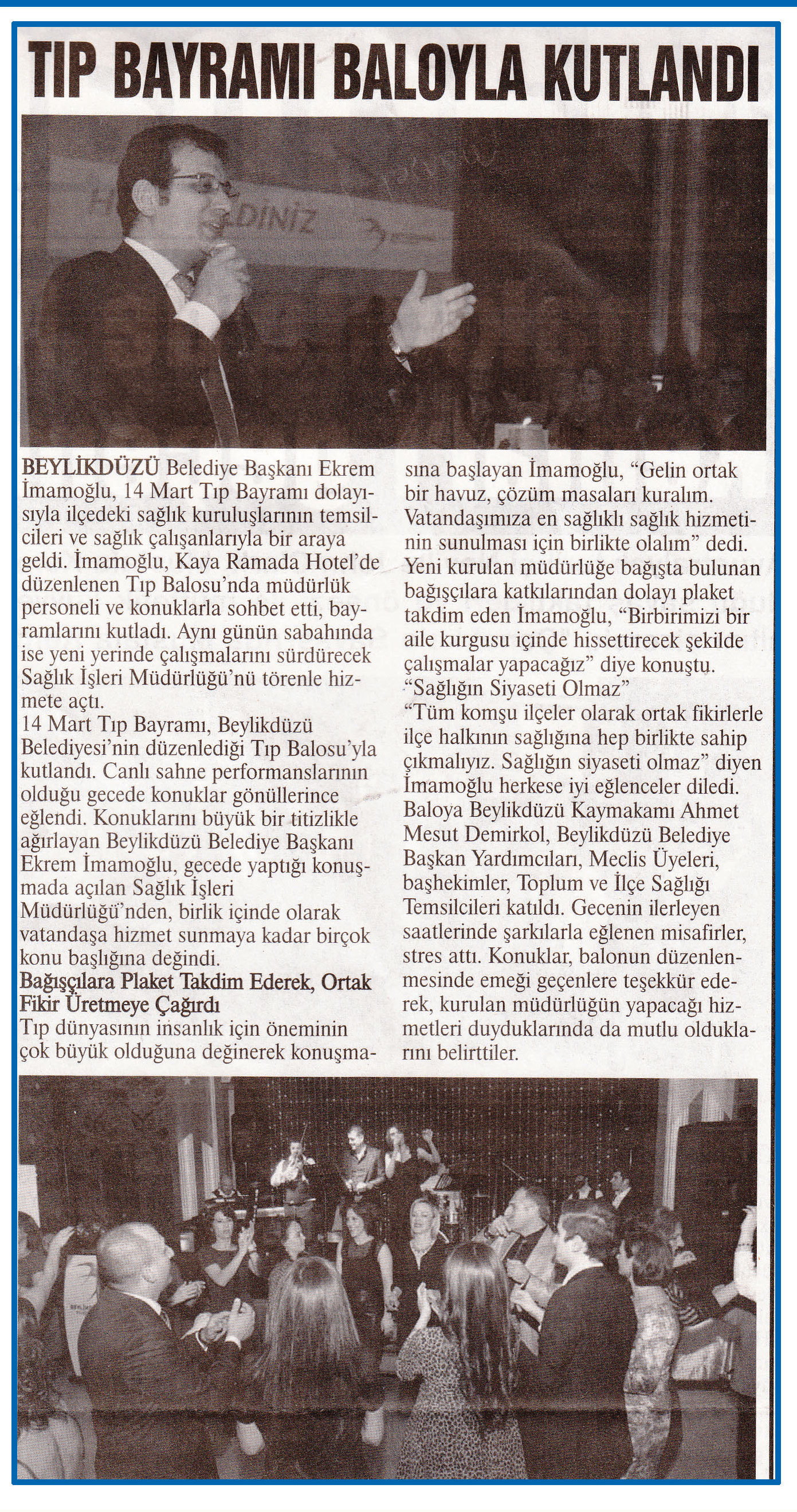 18 Mart 2015 tarihli ''MARMARA'' gazetesi. Beylikdüzü Belediye Başkanı Ekrem İmamoğlu,14 Mart Tıp Bayramı dolayısıyla ilçedeki sağlık kuruluşlarının temsilcileri ve sağlık çalışanlarıyla bir araya geldi.