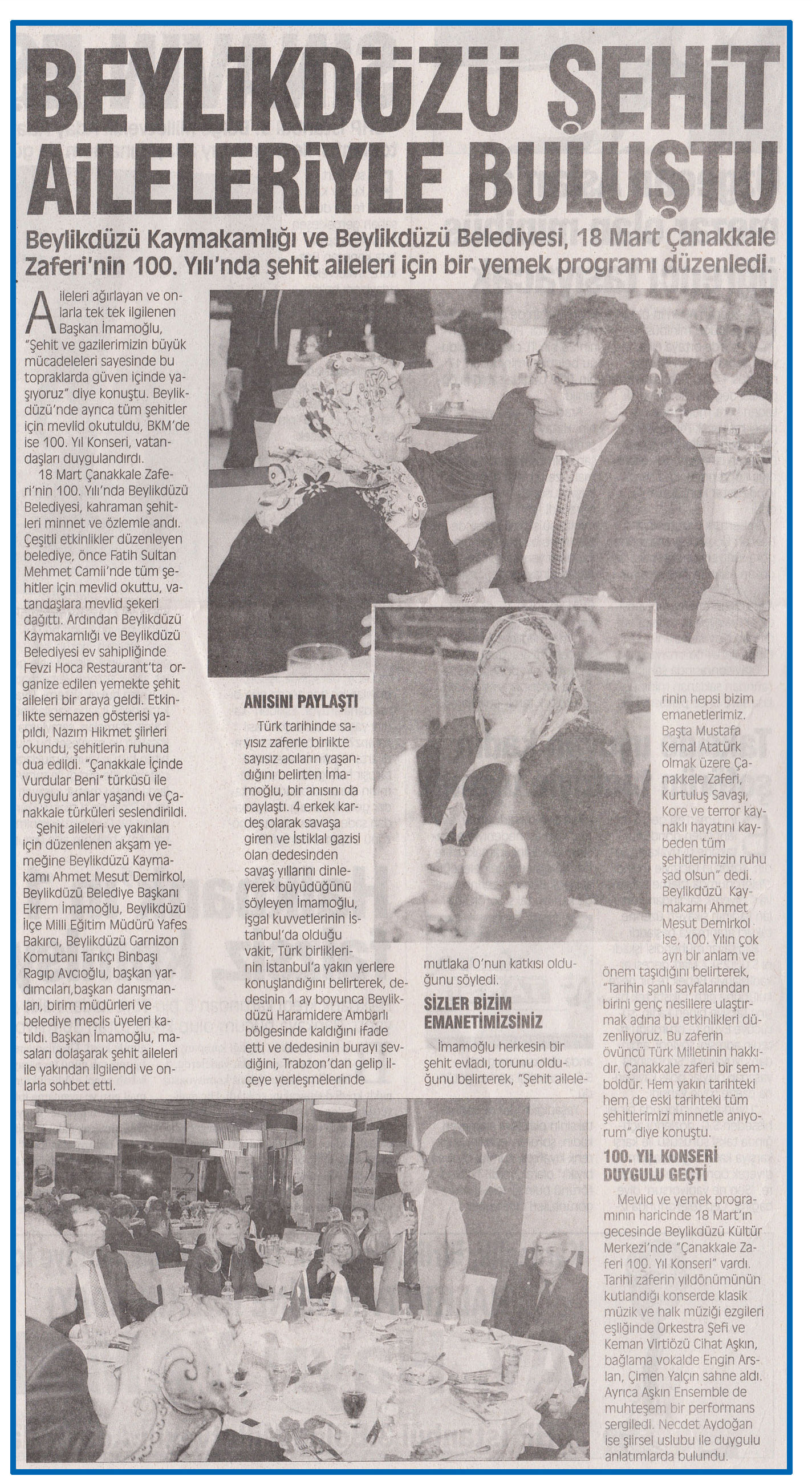 20 Mart 2015 tarihli ''DEĞİŞİM'' gazetesi. Beylikdüzü Kaymakamlığı ve Beylikdüzü Belediyesi,18 Mart Çanakkale Zaferi'nin 100. Yılı'nda şehit aileleri için bir yemek programı düzenlendi.