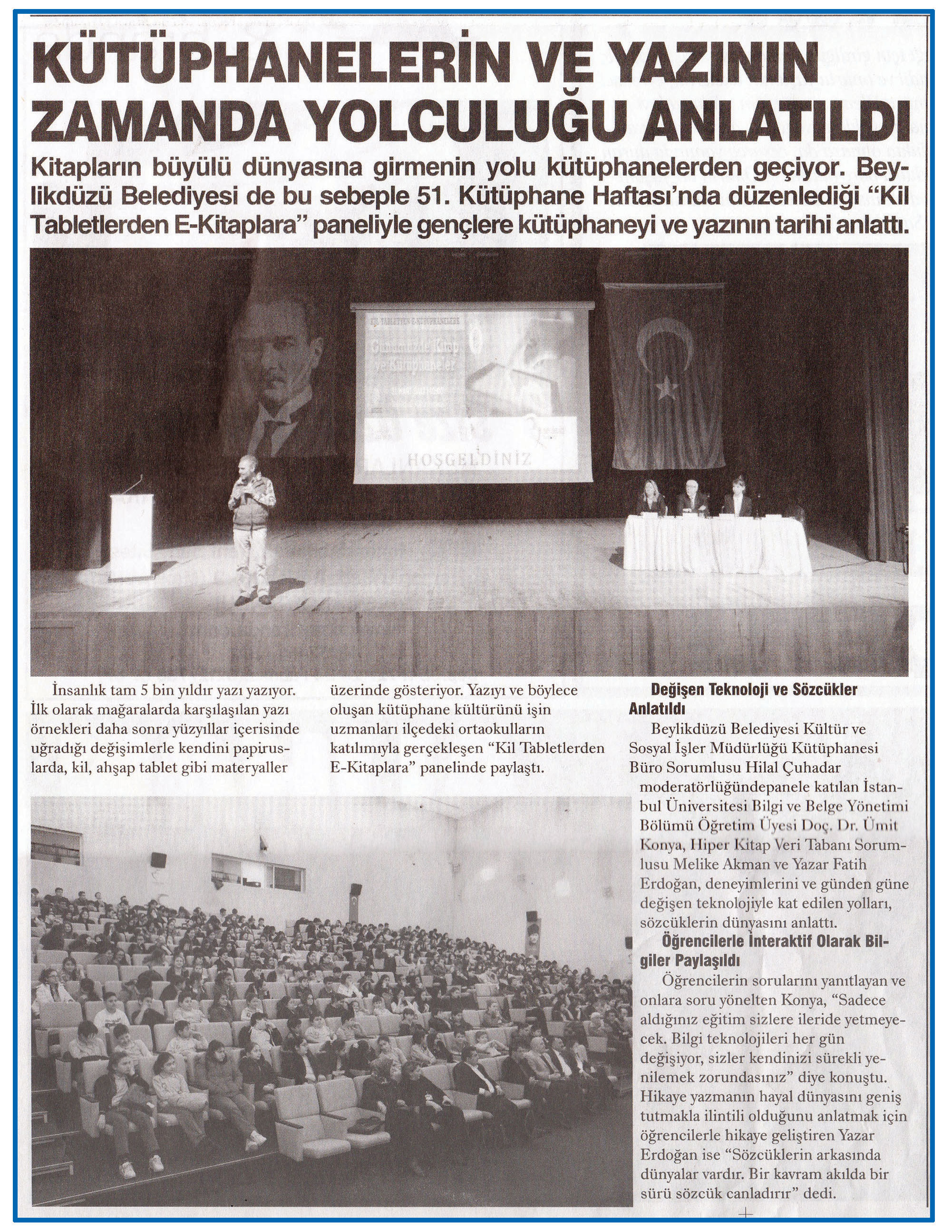 2 Nisan 2015 tarihli ''YENİ GÜN'' gazetesi. Kitapların büyülü dünyasına girmenin yolu kütüphanelerden geçiyor.Beylikdüzü Belediyesi de bu sebeple 51. Kütüphane Haftası'nda düzenlediği ''Kil Tabletlerden E-Kitaplara'' paneliyle kütüphaneyi ve yazının tarihini anlattı.