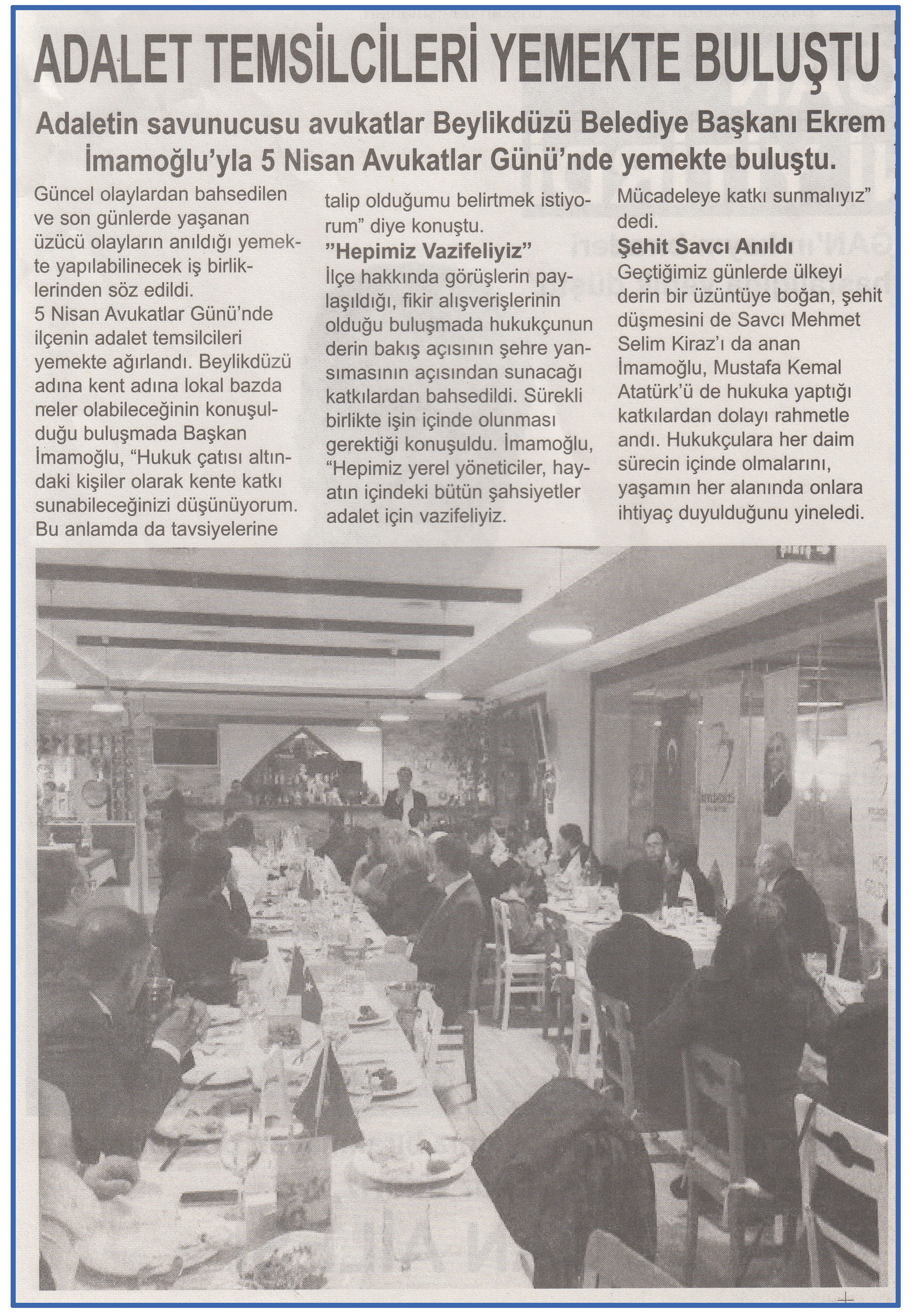 15 Nisan 2015 tarihli ''YANKI'' gazetesi. Adaletin savunucusu avukatlar Beylikdüzü Belediye Başkanı Ekrem İmamoğlu'yla 5 Nisan Avukatlar Günü'nde yemekte buluştu.